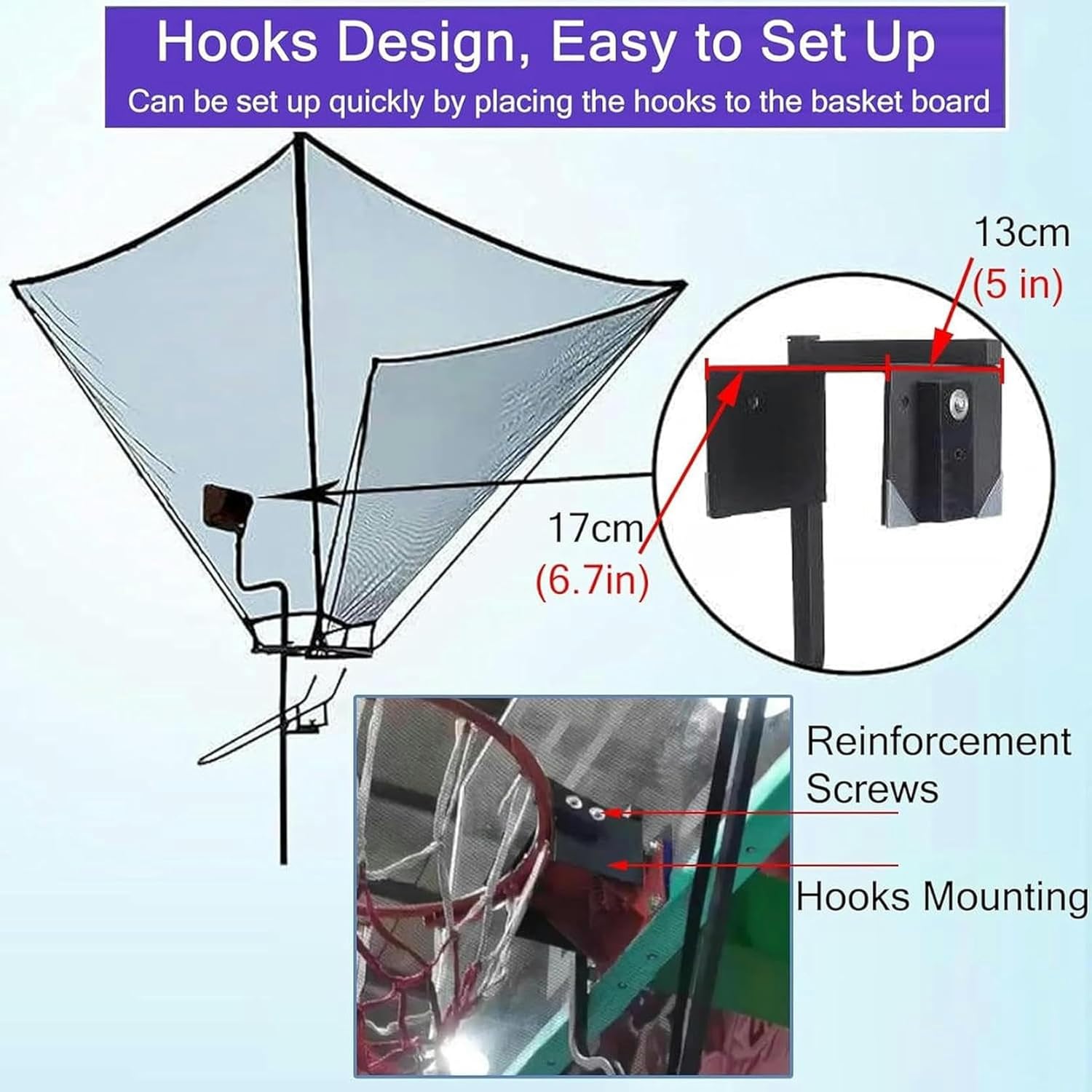 Basketball Rebounder Are you dissatisfied with your shooting percentage Do you have to run after the ball every time you practice Our - basketball rebound net can help you solve these problems! Specifications: Materials: Metal Galvanized Tube Weight: 9KG/20lbs After Folding Size: 118x36x17cm/46.4x14.2x6.7in Product Summary Easy installation and net fits most basketball hoops. Save time picking up the ball and keep shooting. Adjust the shooting action to get a better state. Easy to store and transport you can take it wherever you want. Black backboard net can reduce the refraction and glare of light and increase the visibility during the game. Suitable for personal training and training camp training suitable for people who love basketball shoot the perfect match. Can be given as a gift to family friends or other basketball enthusiasts. Our Inspection Department will test each batch of product to ensure the quality including material test and performance test.Tips Manual measur there will be 1-3cm error please understand. If a slight odor is normal it will disappear within two to three days. Due to light and personal differences in color understanding there will be small color difference in kind prevail.