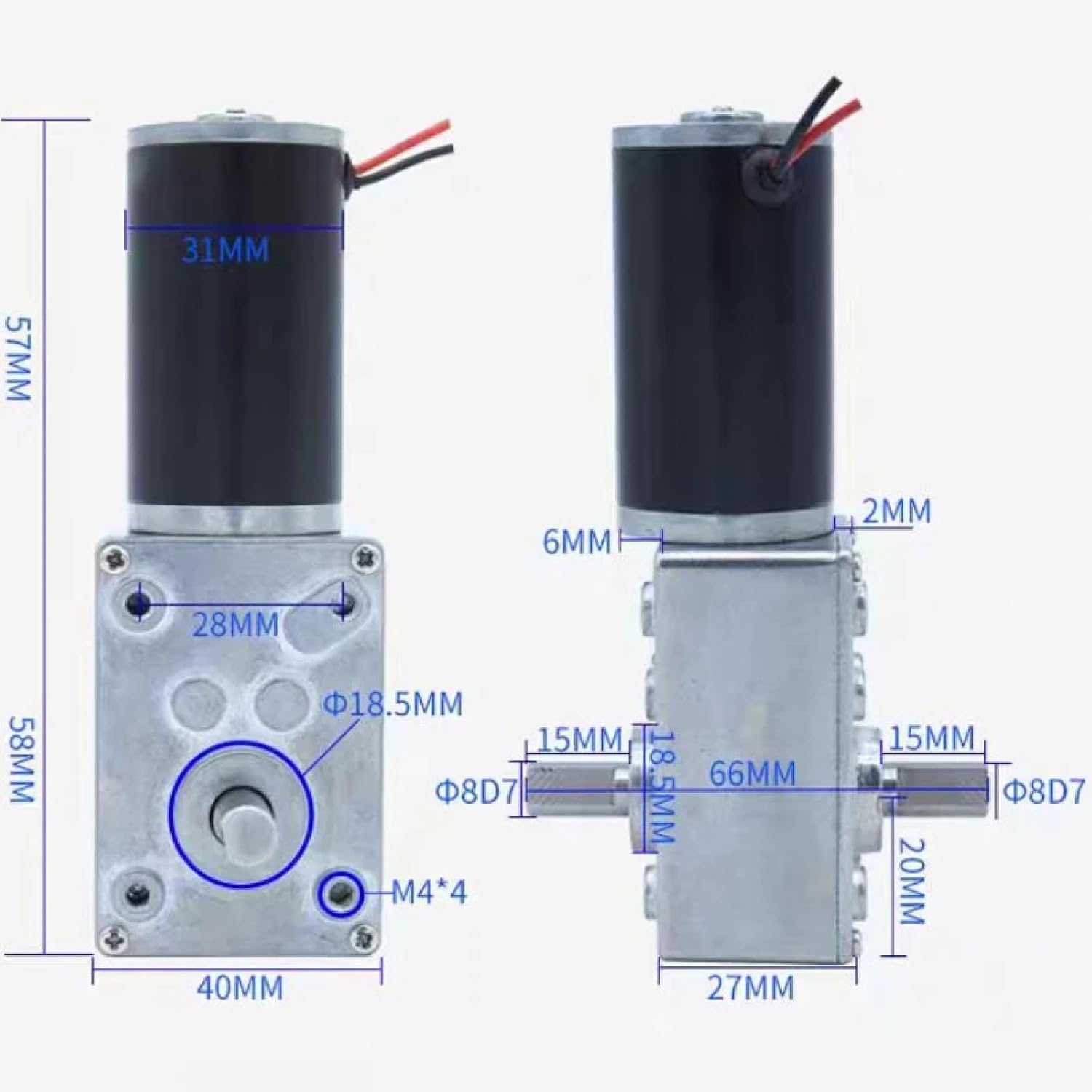 This robust 5840-31ZY double shaft worm gear DC motor delivers impressive performance with its high 70kg/cm torque output, making it ideal for demanding applications like rotating tables and automated doors. The innovative double shaft design provides flexible mounting options and enhanced integration capabilities. Featuring a durable permanent magnet construction and a maximum power output of 21W, this motor operates efficiently with a maximum continuous current of 1.6A. The worm gear reduction mechanism offers inherent self-locking functionality for added safety and stability in various applications. Its totally enclosed design ensures reliable operation and protection from environmental factors. The motor's brush commutation system and comprehensive construction make it well-suited for home appliance applications where consistent, powerful performance is required. The unit combines practical functionality with industrial-grade engineering, delivering dependable operation for automated systems that demand precise control and substantial torque output.