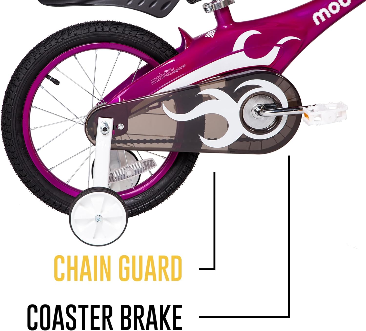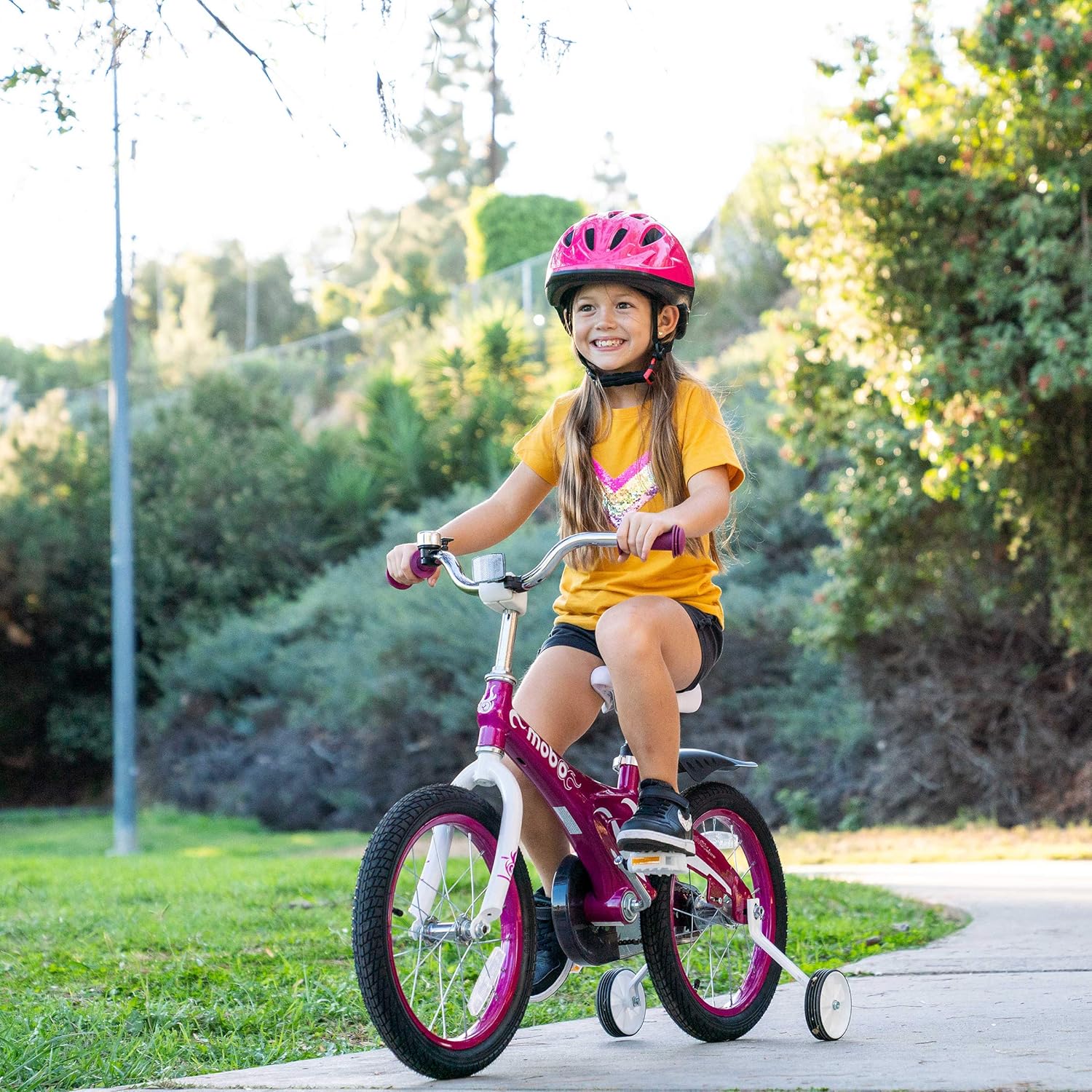 The Mobo Lite 16-Inch training bike is designed to be an ideal starter bike for toddlers learning to ride. Designed to minimize bump and bruises, the Mobo bicycle for toddlers features multiple safety pads and 6 safety reflectors so your child is extra safe while learning. To set up as learning bike, attach the bicycle training wheels. When your child is feeling confident riding, remove the bike training wheels. You can use seat handle to provide extra support during their first few rides. A bike for 4 year old boys and girls and up to 6 years old. For kids 41-53 inches tall and up to 80 lbs. Fits 21 to 26-inch inseams. A quick release seat post and height adjustable handlebars accommodate your child as they grow. 16-inch wheels with air-filled tires provide a smooth ride and outstanding grip in both dry and wet conditions. Single speed design and rear coaster brake are maintenance free. This kids first toddler bike has a strong, lightweight magnesium alloy frame that withstands the bumps of learning. This learner bike comes partially assembled. Just add the seat, handlebars, pedals, reflectors, bell and training wheels, if desired). Includes all tools required. With our padded toddler peddle bike, your child can practice kids bike training with extra safety.