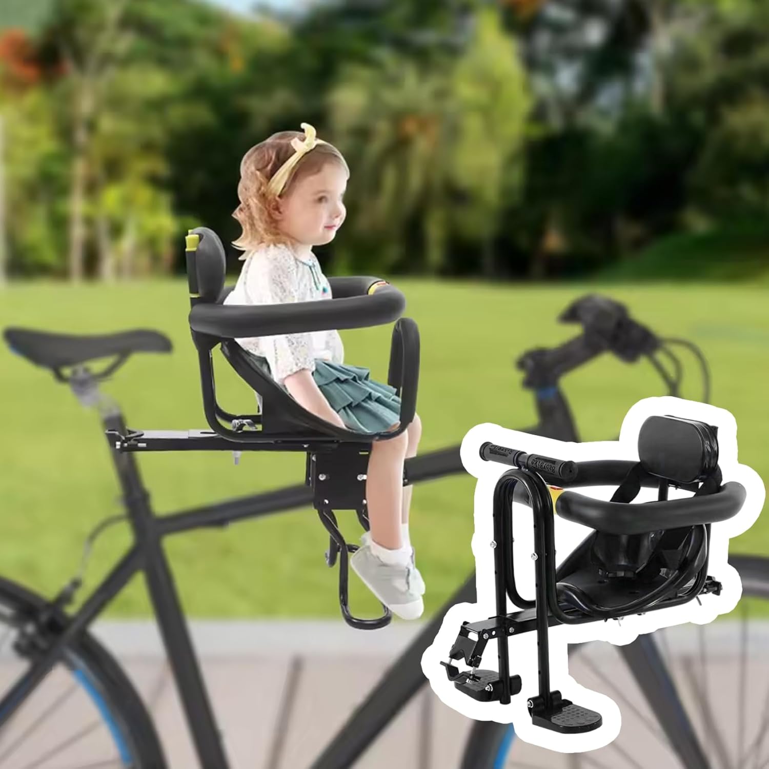 Description: Child Bike Seat Front Mount Toddler Seat for Bike with Safety Belt, Backrest, Footrest & Handle for Children 2~5 Years is a front-mounted child bike seat for toddler safety and comfort, featuring an adjustable safety belt, ergonomic backrest, and footrest to support kids aged 2 to 5; this front bike seat for toddler fits most adult bikes easily with quick installation and removal, includes a convenient handle for child grip and portability, and is crafted from stable materials ideal for use as a kids bike seat replacement, providing a safe, comfortable, and versatile riding solution for families. Features:. Child Bike Seat Front Mount. -Color: Black. -Material: Frame: steel. Note:Manual measurement, please allow slight errors on size.The colors may exist slight difference due to different screens. Package Including 1 x Child Bike Seat Front Mount