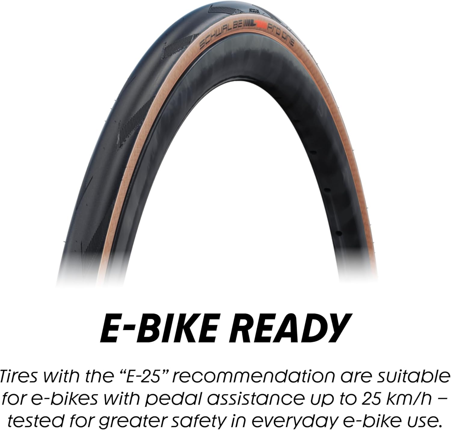 Schwalbe Pro One TLE – The High-End Tubeless Easy Road Bike Tire The Schwalbe Pro One Tubeless is the best road bike tire Schwalbe has ever developed. It combines speed, control, and suppleness for an unmatched riding experience. Thanks to Tubeless Easy technology, this tire is designed specifically for tubeless use and delivers peak performance on any road bike. The Addix Race Compound provides optimal grip and low rolling resistance. Paired with the Super Race carcass, it offers an exceptionally smooth ride. The integrated V-Guard puncture protection reliably prevents flats and damage. Made with fair-trade rubber and recycled carbon black (rCB) from Schwalbe’s own recycling process, this tire combines top performance with sustainable manufacturing. The Schwalbe Pro One TLE road bike tire is the perfect combination of innovation, quality, and experience. Designed for competitive cyclists seeking maximum speed, control, and safety. Pro One TLE versions at a glance: ● Sizes: 20", 26", 27.5", 28" ● ETRTO: 28-406, 28-559, 28-584, 25-622, 28-622, 30-622, 32-622, 34-622, 38-622 ● Variant: Super Race, V-Guard ● Compounds: Addix Race Compound ● Tubeless: TLE (Tubeless Easy) ● Colors: Black, Transparent Sidewall BRAND PROMISE At Schwalbe, quality comes first. We deliver premium bike tires and accessories that meet the highest standards. With innovative technologies and a passion for cycling, we provide the best solutions for a safe and dynamic riding experience. Trust Schwalbe.