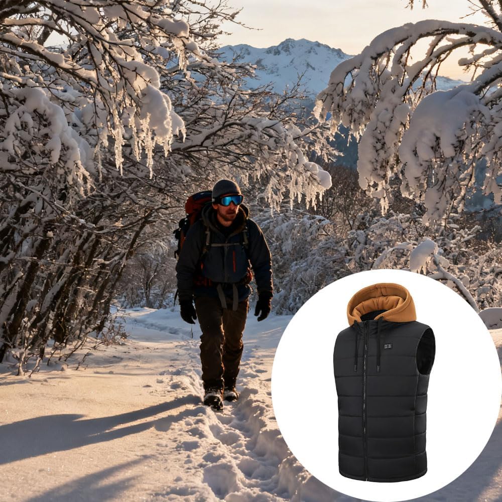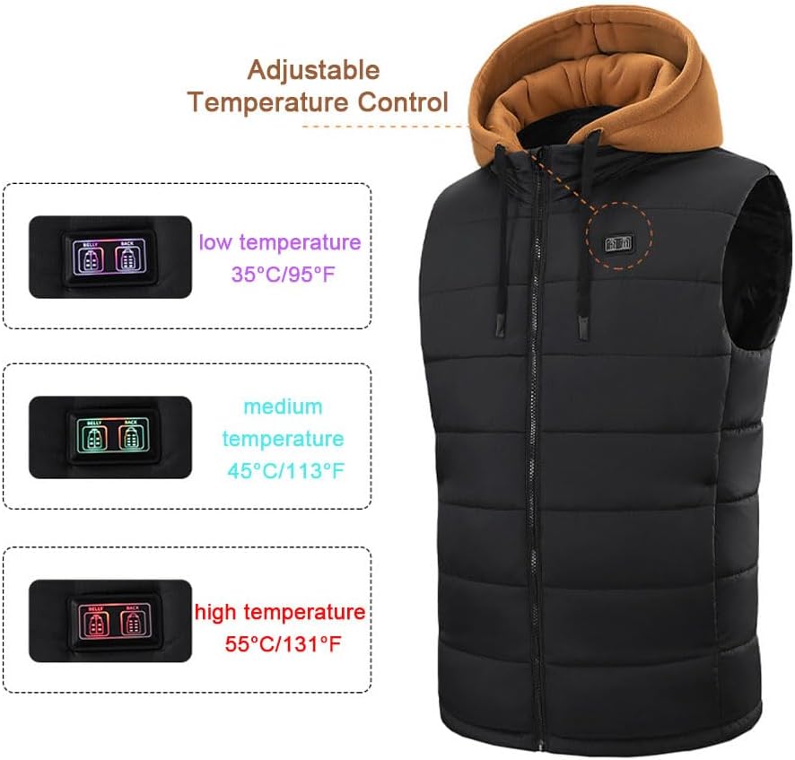 Feature:【Reliable Fabrics】The heated vest is made of nylon fabric and filled with high quality acetate fiber for extra warmth. High quality fabric is not easy to pilling, not easy to produce static electricity, thick coat can withstand the cold, resist the invasion of cold wind, autumn and winter warm comfortable clothing.【Adjustable Temperature Control】This electric heated vest has three temperature settings (low temperature 35°C/95°F; medium temperature 45°C/113°F; high temperature 55°C/131°F). Whether indoors or outdoors, you can choose the ideal temperature to stay warm. The intimate temperature settings and thermostat function will provide your entire body with a constant supply of heat, keeping you warm all over.【Various Heated Zones】The vest has a built-in advanced carbon fibre heating element with 14 heating zones covering the front chest back and shoulder. It heats up quickly and dissipates heat evenly, which can be warmed up quickly when plugged in. Wearing this heating vest, you will be wrapped in warmth in all directions, so that travelling in winter will not be a problem. Note: This product is only a heated vest. Heating power supply is not included, please bring your own power bank.【Thoughtful Design】Heated vests are L sizes that fit the contours of the body perfectly. The design is thoughtful, with a removable hood, pockets with zips that are silky smooth, and a hem that is hemmed to keep the wind out, ensuring a warm and comfortable wearing experience.【Easy to Clean】Heating vest can be hand-washed and machine-washed, repeated water washing will not easily loosen and deform. Because the power connector is waterproofed, no need to worry about it being damaged. Warm tips, remember to take out the batteries hidden inside the clothes when you wash them, and put them back in after drying thoroughly.Specification:Name: Heated VestMaterial: NylonSize: LColor: Black, White, Red, Green, BrownPackage Included:1 * Heated Vest