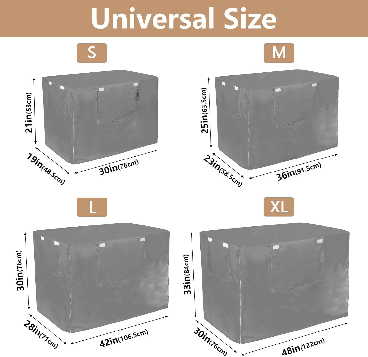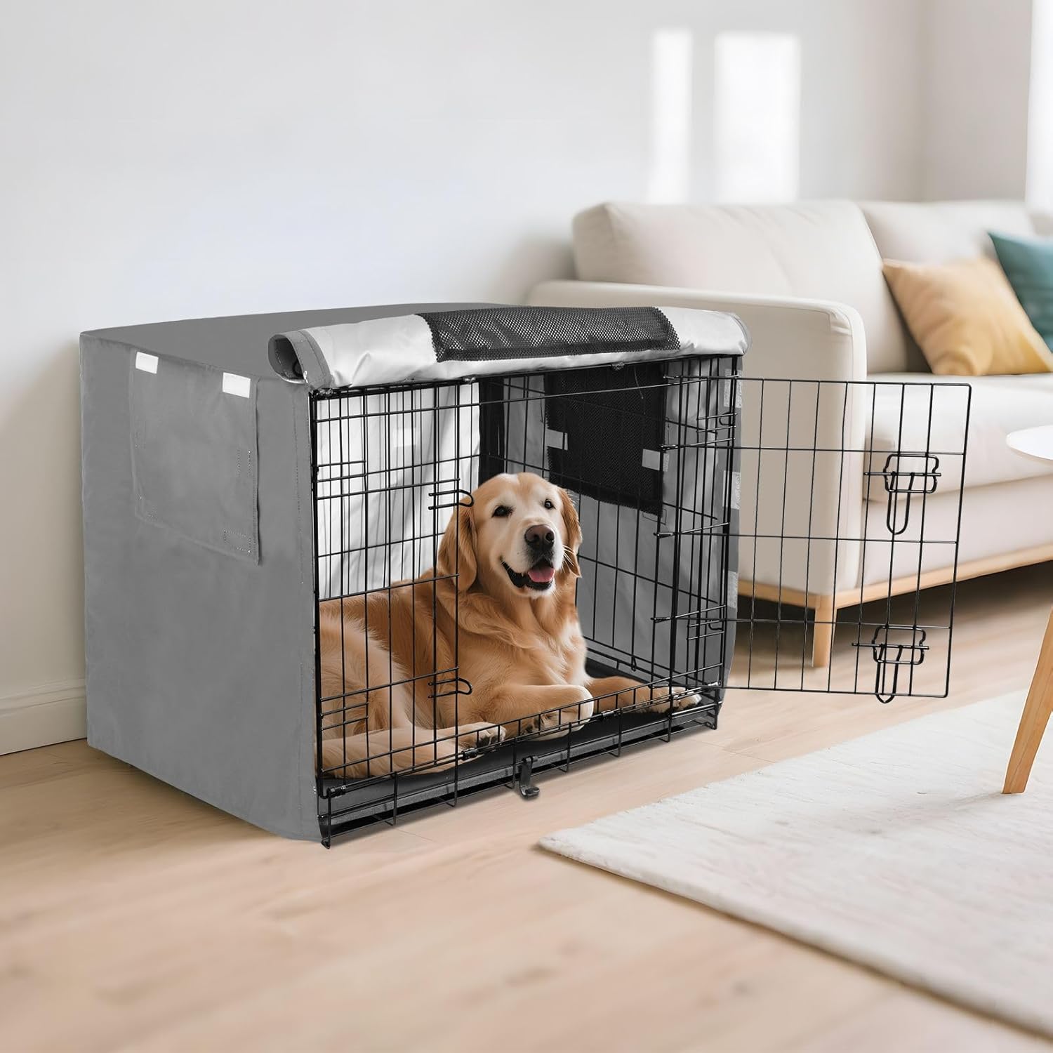 Weather-Resistant Dog Crate Cover is made of 600D silver-coated oxford fabric that provides exceptional protection against wind, rain, and sunlight. This material prevents your pet from scratching the crate and blocks most direct sunlight, ensuring a safe and comfortable space.Simple and Secure Setup features an easy fastening system, making it effortless to install without the need for tools. This travel dog crate cover fits securely onto your dog crate, ensuring it stays in place and provides protection at all times.Ventilation for Comfort with mesh windows on all sides, our dog kennel cover ensures optimal airflow, keeping your pet cool and comfortable even during long periods inside the crate. The mesh design also provides privacy and security for your pet.Wind-Resistant and Stable with four adjustable tie-down straps at the bottom, this dog crate cover stays securely in place, preventing it from being blown away by the wind or removed unintentionally. This feature ensures that your pet’s crate remains stable and protected.Versatile Use Ideal for both indoor and outdoor settings, this travel pet crate cover provides the protection your pet needs in various environments, whether at home or on the go. The compact design makes it easy to store and travel with.