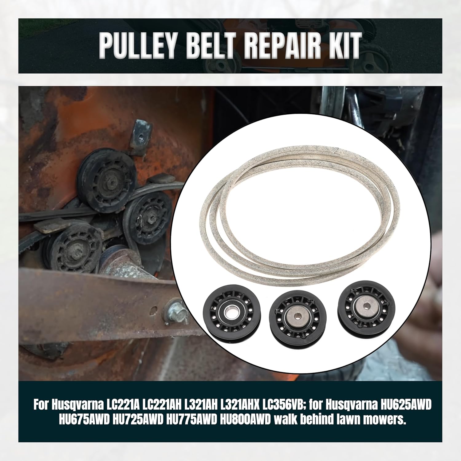 Specifications: Product Name: Idler Pulley Belt Rebuild kit Suitable for Husqvarna 22" AWD mowers: for LC221A / LC221AH for L321AH / L321AHX for LC356VB for HU625AWD / HU675AWD / HU725AWD / HU775AWD / HU800AWD Package List: 587969201 Pulley x 1pcs 587973001 Pulleys x 2pcs 3/8"x 63.5" Belt x 1pcs 586859604 Mower Blade x 1pcs Note: Please carefully check your pulley sizes before purchasing Contact us if you have any questions, comments or issues, your satisfaction would be our greatest motivation