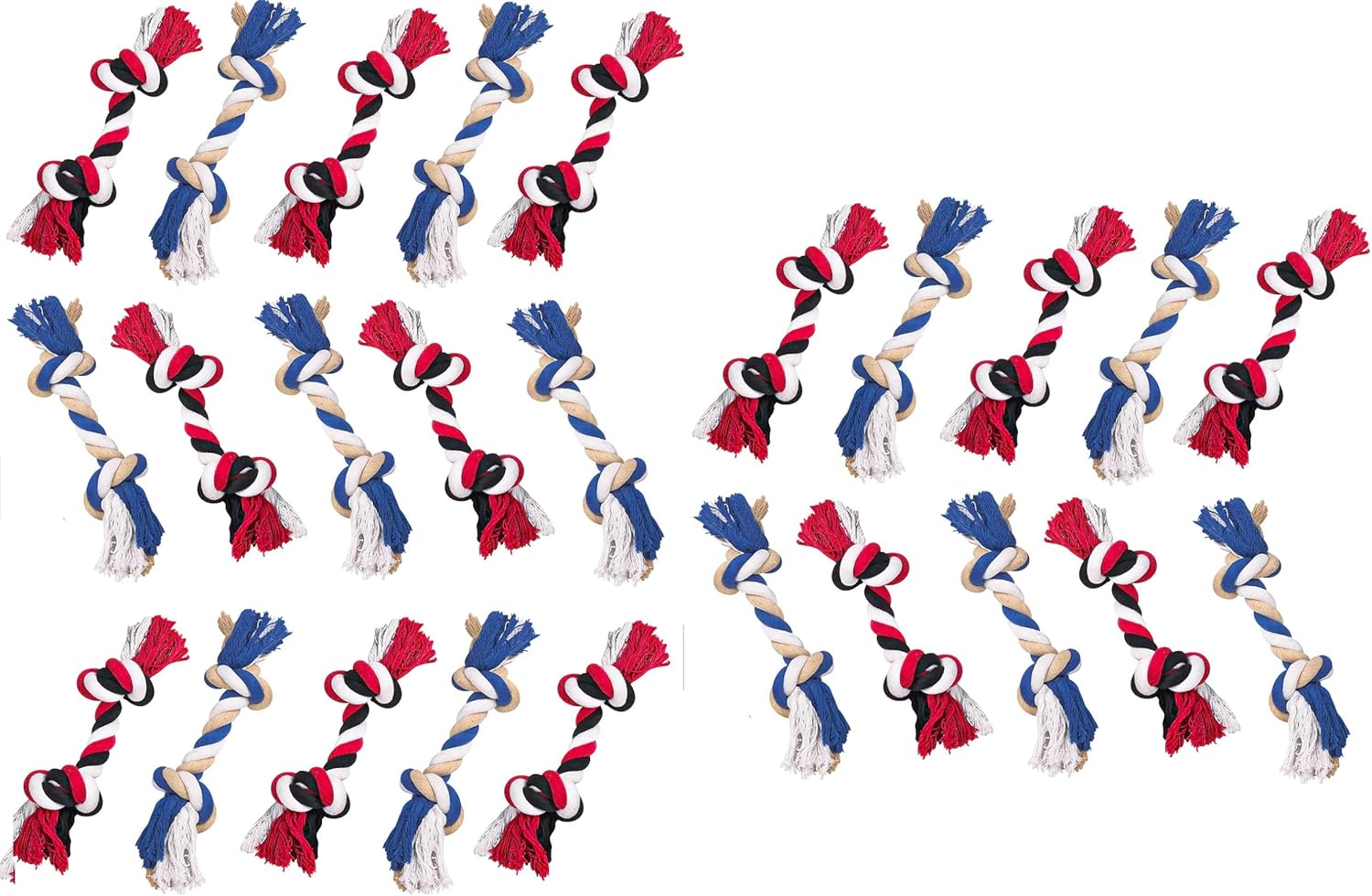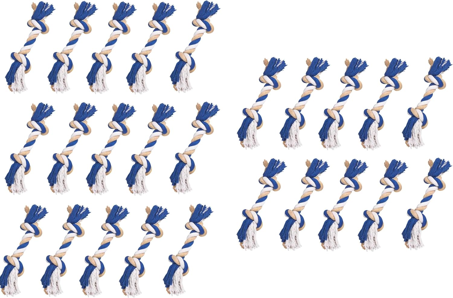 Our 8 Inch Rope Bones are a great way to satisfy a dog's natural urge to play. These rope dog toys are made from natural cotton rope. Natural cotton rope toys satisfy a dog’s urge to fetch and tug. Help to naturally clean teeth. Material: Cotton rope dyed with natural, food-safe dyes. Bulk packs are available in red, blue or a mixture of both colors. Choose from our cost conscience bulk packs of 5, 10, 25 or 50 rope bones. Makes great gifts and donations for small to medium dogs.