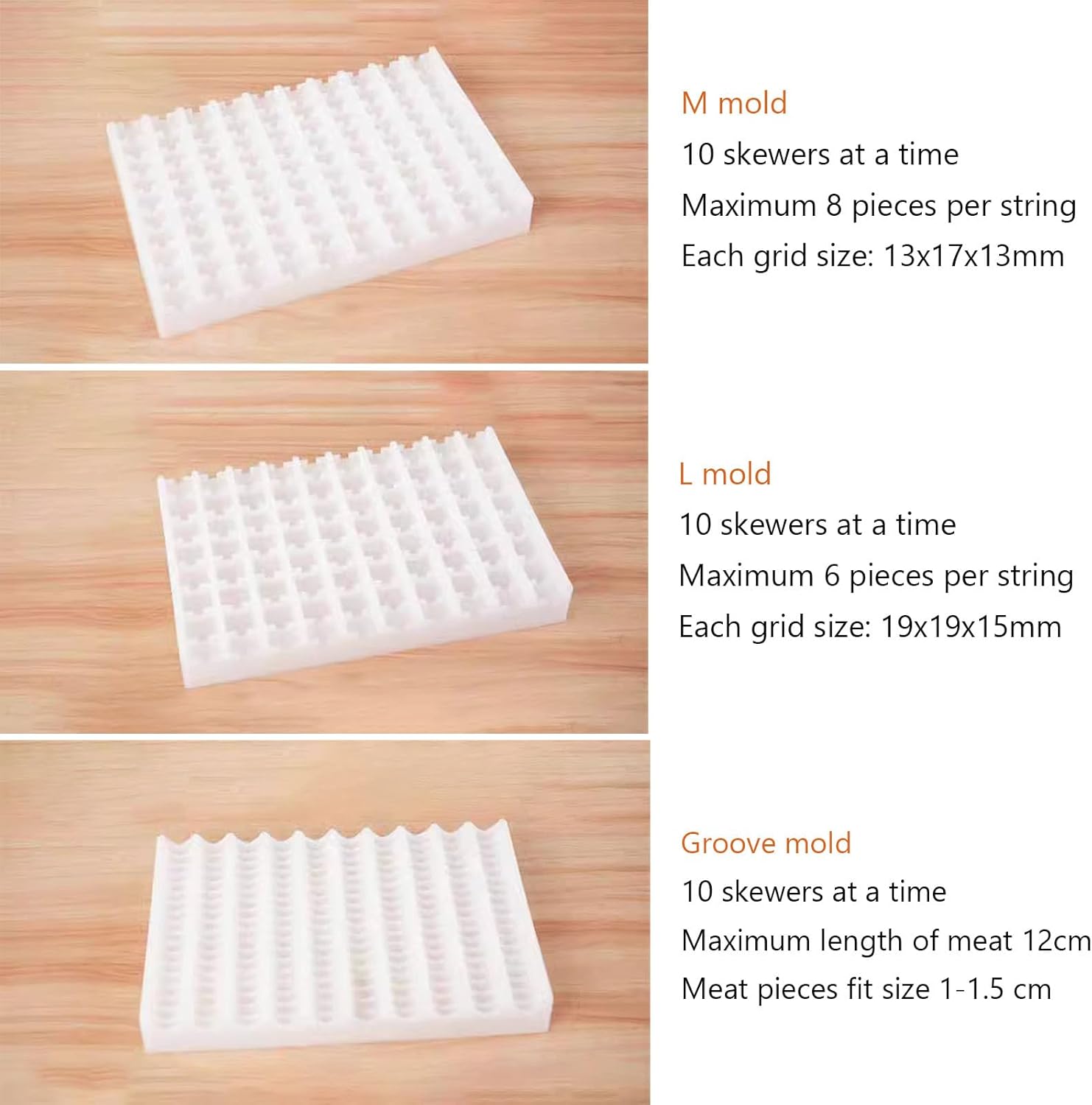 Specifications:Material: ABS PlasticColor: WhiteSize: 25x16.2x3cm/ 9.8x6.4x1.2inThree types of molds available:M mold10 skewers at a timeMaximum 8 pieces per stringEach grid size: 13x17x13mmL mold10 skewers at a timeMaximum 6 pieces per stringEach grid size: 19x19x15mmGroove mold10 skewers at a timeMaximum length of meat block 12cmMeat pieces fit size 1-1.5 cmPackage Details:4 x kabob maker moldNote:Packed with only 4 skewer molds for use with a kabob maker machine.Due to manual measurement, the size and weight may have a certain error.Due to the difference between different monitors, there may be a slight color difference existed.
