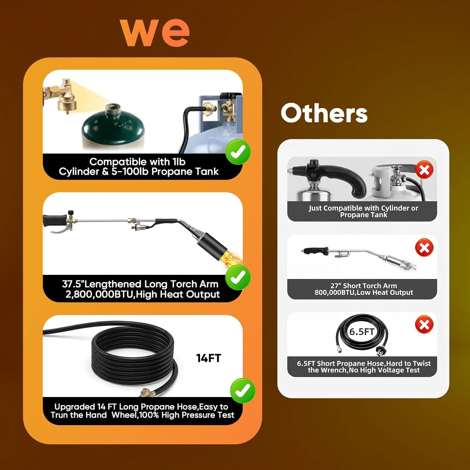 Tackle tough outdoor jobs with this high-output propane weed torch. Designed for fast heating and precise control, it combines a rugged metal torch head with a comfortable handle and an extra-long 14-foot hose so you can move freely around gardens, paths, and driveways while keeping a safe distance from the flame. The integrated self-igniter provides quick, reliable starts—no matches required. When you need extra power, the turbo trigger delivers a burst of heat on demand, making quick work of stubborn weeds, packed snow and ice, or spots of old road paint. A simple valve lets you fine-tune the flame for delicate edging or full-power burns. Built from brass and stainless steel, this torch is made for durability and steady performance. It connects to common propane cylinders (tank not included) and detaches easily for storage after the job is done. Whether you’re clearing weeds without chemicals, softening roofing or asphalt, or thawing frozen areas in winter, this multi-purpose torch gives you the heat, reach and control you need.