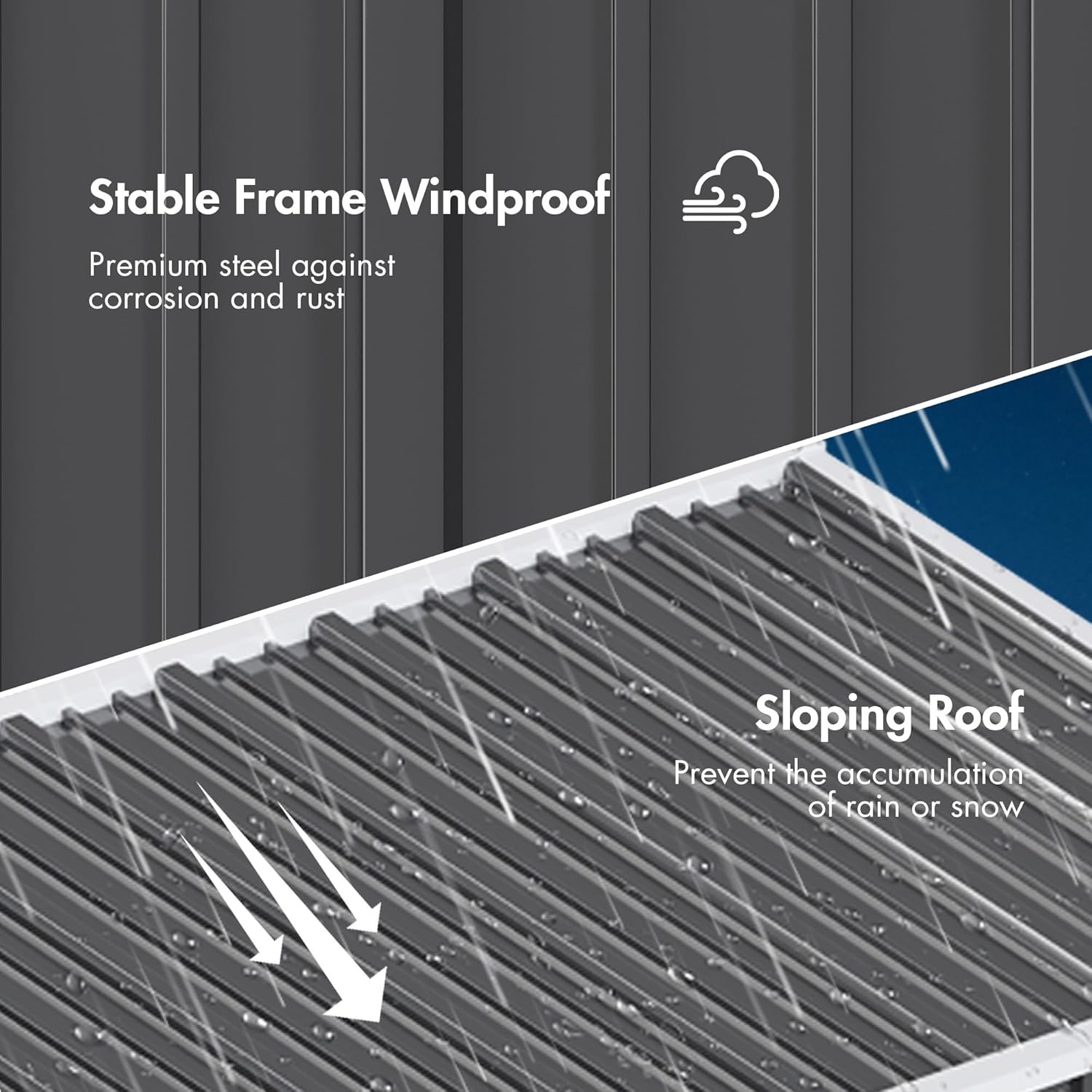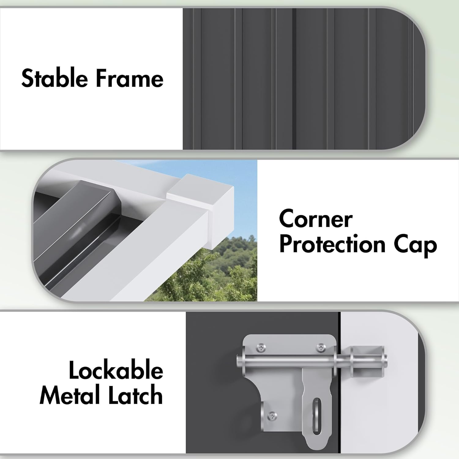Why Choose Our Metal Storage Shed?✔ Large storage space, say goodbye to clutter✔ Galvanized steel and rust prevention process, long service life✔ Thickened metal frame, stable and wind resistant✔ Tilted roof design to prevent water accumulation✔ Security protection, lockable design✔ Easy installation, 1-2 people can complete itMulti Functional Scene, Versatile In One Shed🌿 Family Courtyard: store gardening tools, outdoor furniture, and maintain cleanliness. 🚴 Garage/Terrace: Store bicycles, camping equipment, and free up indoor space. 🐕 Pet Shelter: Provides a resting area for pets to shelter from wind and rain. 🛠 Warehouse: Classify hardware tools for immediate use and retrieval, making work more efficient.Specifications:Colour: BlackMaterial: Galvanized SteelSize: 162x 92x180 cmDoor Size: 64 x 164 cmAssembly Required: YesPackage Content:Garden Shed x 1Glove x 2Manual x 1Accessories Pack x 1