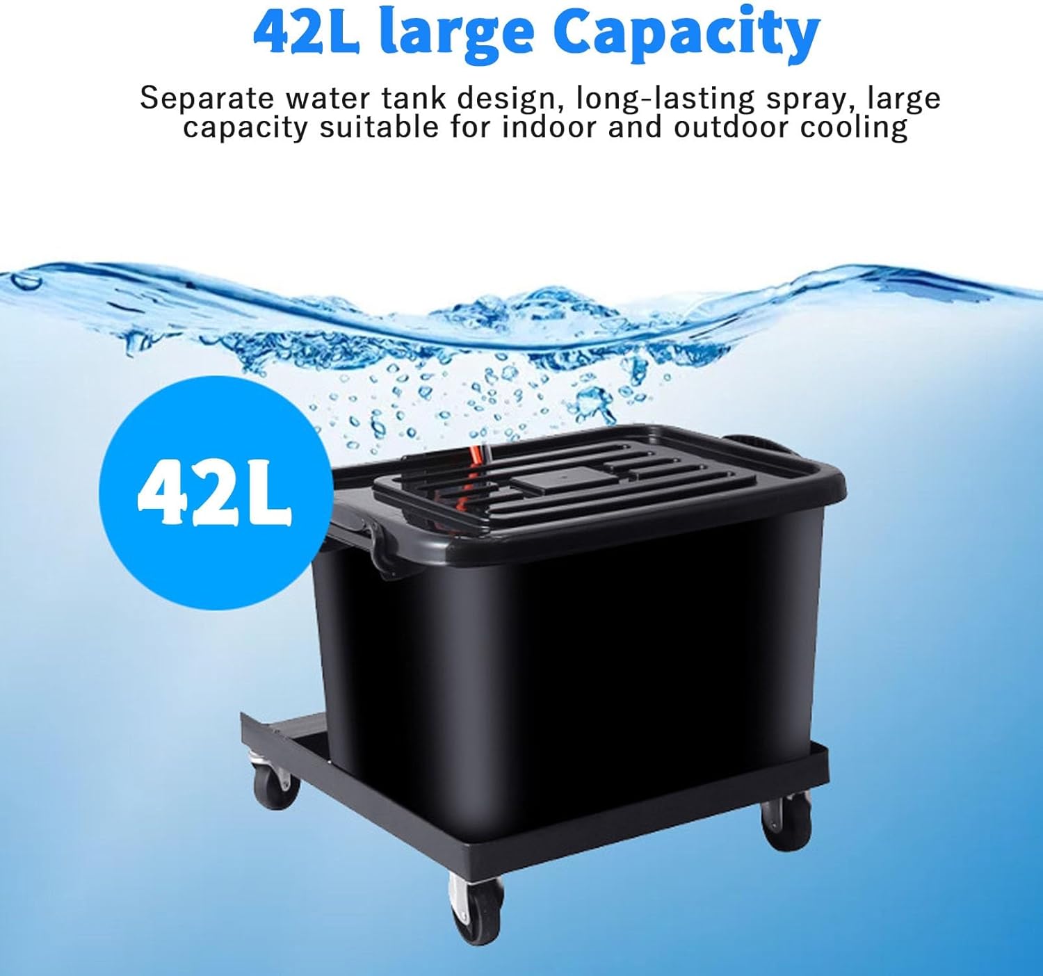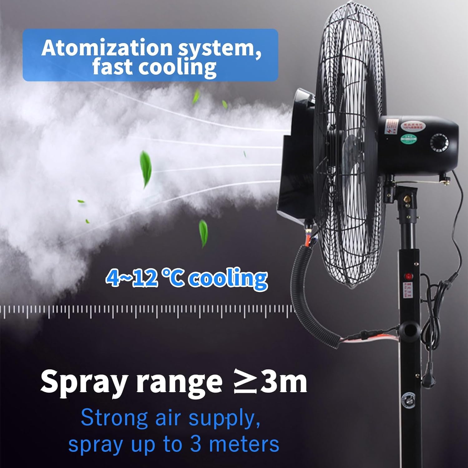 The industrial fan is perfect for outdoor use, low noise, and equipped with sturdy wheels. You can easily transport this fan with mist to your terrace and backyard, or almost anywhere you want to use it.Specification:Name: High Velocity Oscillating Stand FanMotor type: pure copper motorBlade diameter: 65cm/75cmColour: BlackVoltage: 110VPower: 320W/380WWind adjustment: 3 gearsSpray adjustment: adjustableSpray distance: 3-10mWater tank capacity: 42L- Package includes:1 x Stand Up Fan