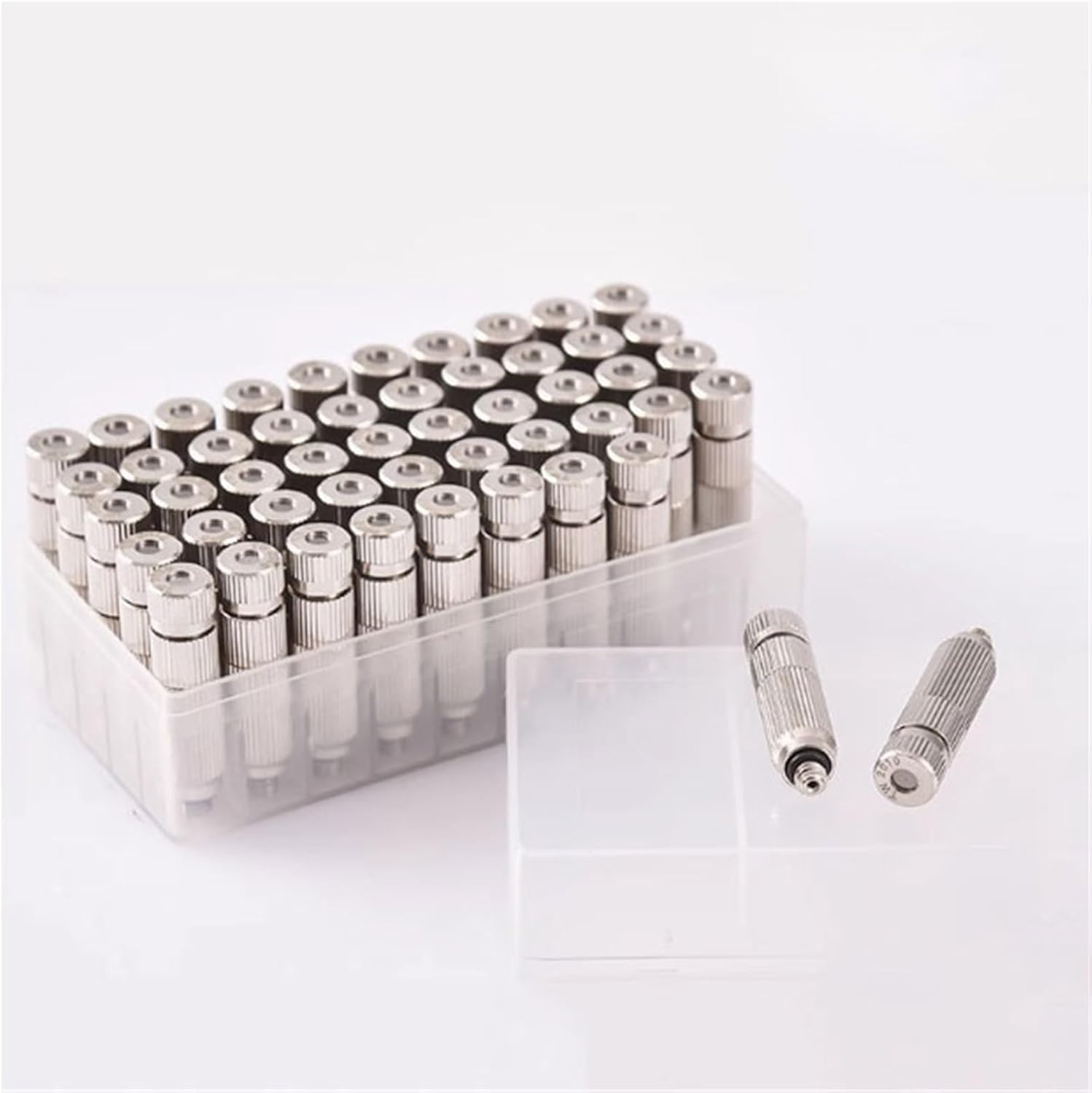 Specifications:Material: stainless steelColor: As picture showHole: 0.15 mm - 1.0 mmpressure: 20-70bar (280-995PSI)Characteristics:- The main body is made of stainless steel, anti-rust - Leak-proof: Self-sealing o-ring included with each nozzle, no tape or sealant is required.- Easy to install: Easily screw into any 3/16" threaded mist nozzle opening.- ApplicationWet cleaning Air humidifyingThe chemical treatment Chemical spraysEvaporative cooling flue gas Fruit spray waxParts of cooling Salt spray testThe workshop humidifying Artificial fogOther places humidificationIncluded in the package:50pcs x brass misting nozzles (10 Orifice diameter available)(Does not include T-shirts and other accessories)Interview:Hard water, lime and calcium can clog the nozzles of sprayer, Clean nozzles periodically by soaking in vinegar solution and hot water