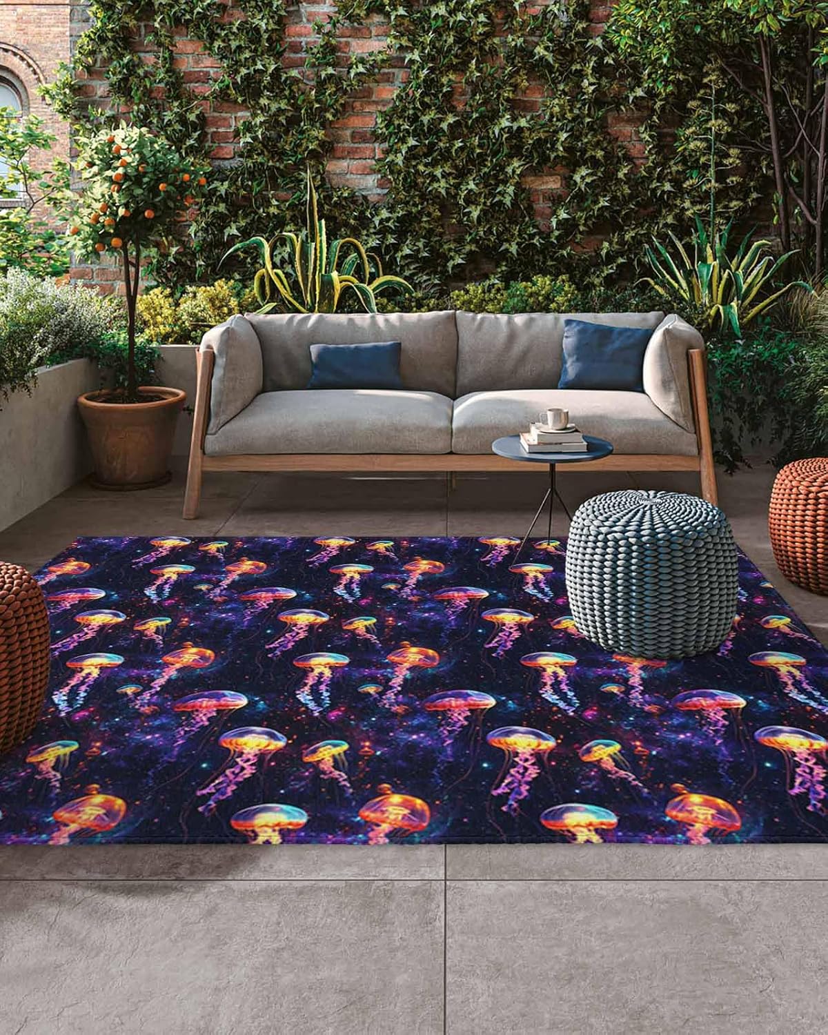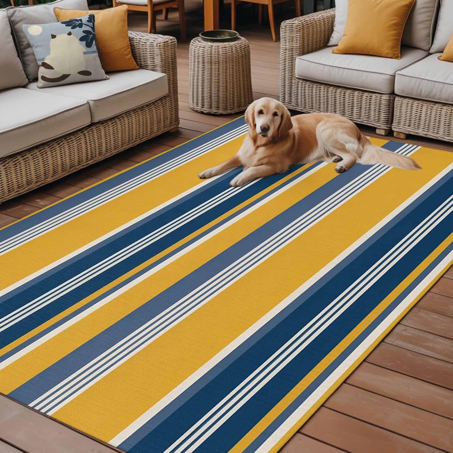 Enjoy supreme comfort and plush softness under your feet.Transform your existing decor with the chic modern style of our outdoor area rug carpet.Size4x6 ft5x8ft 6x9ftThickness measures: 0.2 in.Shape: RectangularBacking: Non-skip rubber points.Package includes:1 PC x Area RugsSpecial Note: Rugs may contain temporary creases upon arrival, allow time for creases to flatten and settle.How to remove carpet creases? 1. Wet the carpet and flatten it to air dry 2. Use a steam iron 3. Roll the area rug in reverse of the wrinkle or crease 4. Use a steam cleanerPremium MaterialMade from high-quality, soft, comfortable and strong durability. Provide a warmer and softer feel under your bare feet and knees, without damaging your deck or grass.Double-layer, outdoor mat is breathable, easy to clean, washable and quick dry.Multiple OccasionOutdoor rugs suitable for terrace, balcony, deck, garden, beach, porch, RV, camping, garage and other places.Versatile Mats Outdoor PatioThe outdoor rug can fit your patio style well, elegant as it is functional, not only protects the floor, but also adds a new view and to show off your personal style.Ideal Home DecorThe soft outdoor carpet is available in multiple colors and sizes to suit your different styles and needs, making it an ideal choice for home decoration.Wash TipsWhen the rug is dusty, only need to wash it with a hose outdoors.