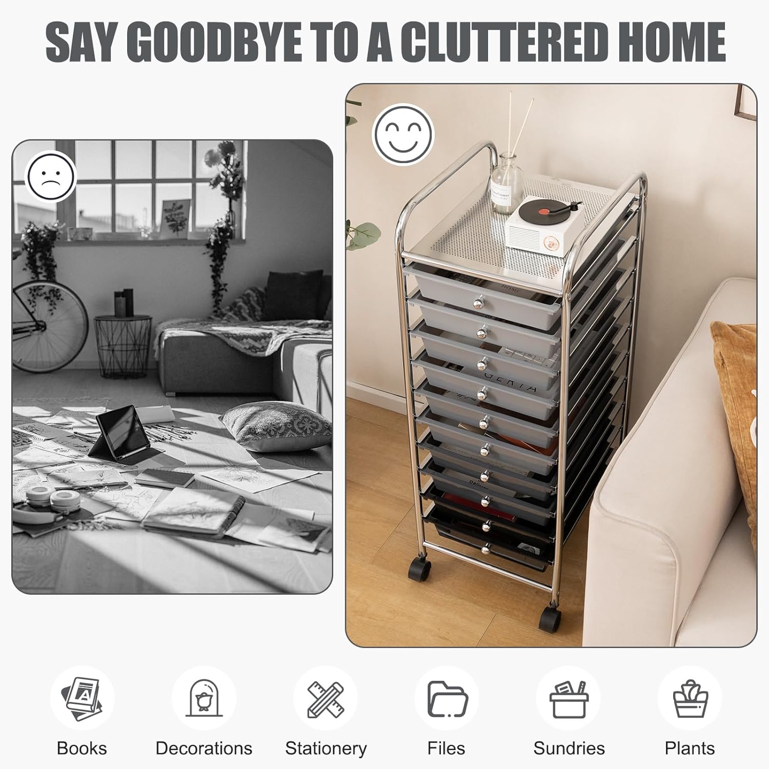 Description:Are you looking for a storage cart to place your files in order? HOMGX drawer cart is a good choice!HOMGX rolling storage cart is a versatile and practical solution for organizing and storing your belongings. With its 10 spacious drawers, larger than A4 paper size, it provides ample space for paper, documents, or children's toys. The cart is supported by a durable chrome finished steel frame, capable of holding up to 22lbs. The utility cart features portable handles, convenient knobs for easy pulling, and 4 swivel wheels with 2 lockable brakes for stability. The cart is easy to assemble and clean. Suitable for teachers, parents, beauticians, craftsmen, and artists.Features:10 spacious drawers provides large capacityDurable metal frame to keep stable and sturdyPortable carrying handle for comfortable grip and pullConvenient knobs, allowing for effortless pulling4 wheels can be swiveled 360 degree and moved silentlyPush down the toggles on the wheels can fix the drawer cartWith detailed instruction, the rolling cart is easy to installWaterproof PP material is easy to clean with dry or damp clothGreat for store files, paper, toys , pens and other itemsSuitable for home, office, art studio, beauty salon and so onSpecifications:Material: Metal, PP OverallDimensions: 15’’ x 13’’ x 34’’ (L x W x H)Interior Dimensions of Drawer: 15’’ x 11’’ x 2.5’’ (L x W x H)Tabletop Dimensions: 14.5’’ x 11’’ (L x W)Space Between Handle and Top: 3’’Space Between Cart and Ground: 3.5’’Net Weight: 9.5 lbs