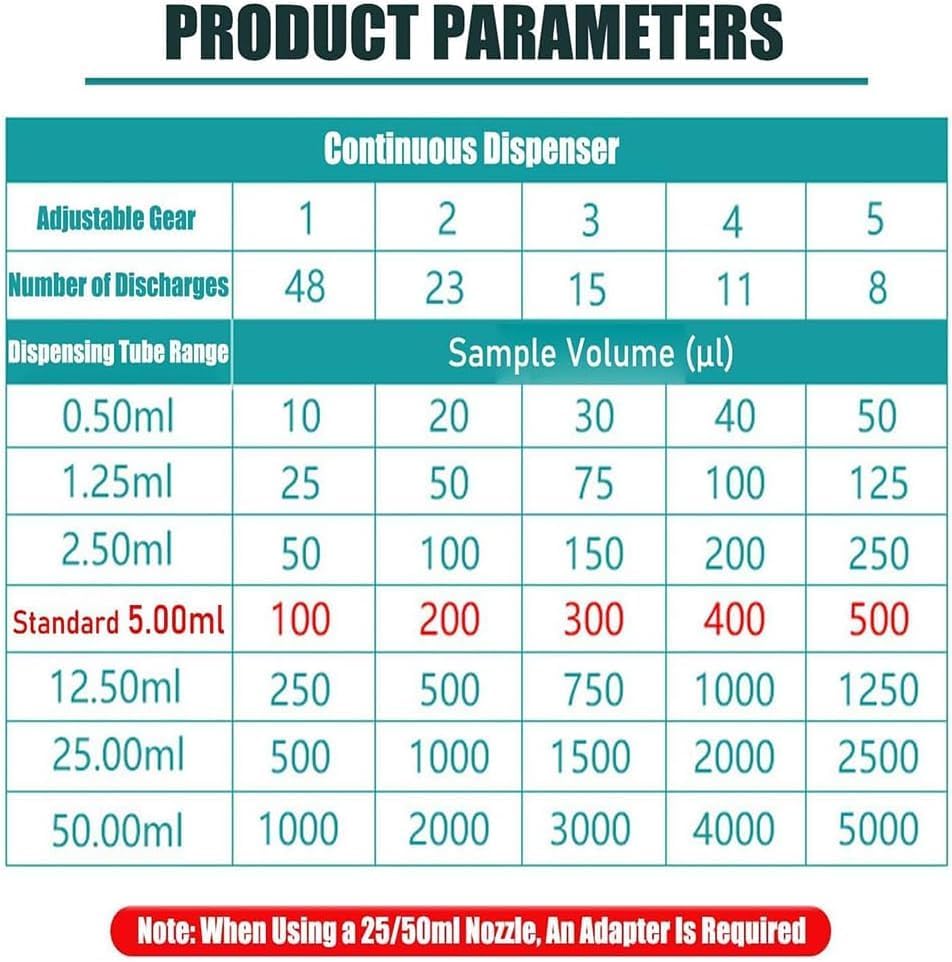 - Gear position visual window, 1-5 gears can be adjusted at will, easy to operate. - Nozzle connection, with high chemical resistance, easy to observe the sealing condition of the nozzle. - There is a tip locking lever on the tip to lock the dispenser nozzle. - Note: Adapter is required when using 20/50ml pipette tips. Specification: Adjustable gears: five gears Number of drains: 48/23/15/11/8 (corresponding to 5 gears) Total volume range: 0.5-50ml; standard pipette tip 5ml (range: 1ml-5ml) Packing list: Continuous allocator x1 5ml pipette tip x1