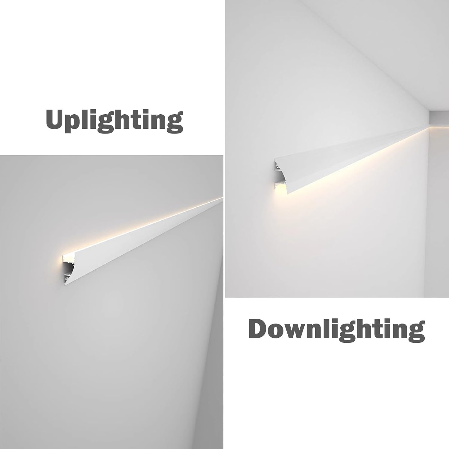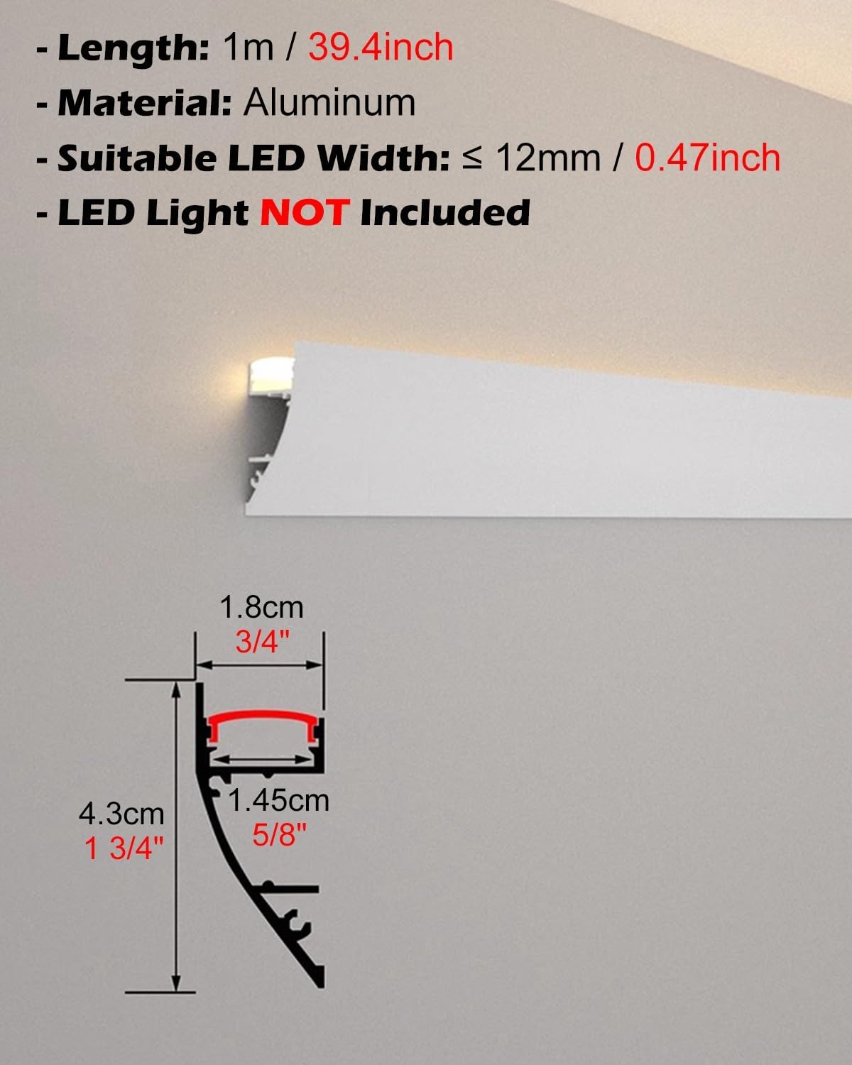 Transform your living space with our premium crown molding lighting solut, designed to provide a ntle glow while enhancing the ambiance of any room. This versatile LED skirting board not only elevates the aesthetic appeal of your home but also integrates seamlessly into various design sles, making it an ideal choice for living rooms, bedrooms, and hallways. **Specificats:** - Material: Aluminum - Color: Ele White - Length: 1m (3.3ft) with customizat opts available - Catible LED Width: ≤ 12mm (1/2") **Key Features:** - **Customizable Length:** Easily cut the channel to fit your specific needs, ering a perfect fit for your space. - **Dust Protect:** s your LED strips from dust, prolonging their lifespan and maintaining their brightness. - **Soft, Inviting Light:** Creates a warm atmosphere that enhances your decor without overwhelming brightness. - ** and Low Maintenance:** Crafted from high-quali aluminum, our channel is designed to withstand wear and tear while remaining easy to clean. - **Simplified Installat:** Installs effortlessly on wall or ceiling s without the need for a suspended ceiling or grooving. **Packa Includes:** - 1 x Aluminum Channel **Addital Notes:** - For corner installats, please reach out for catible corner connectors. - LED strips are not included; ere you select strips with a width of ≤12mm for cali. - For a flless h, coder using seam sealer or repair paste (not included) to conceal seams. - Slight variats in dimeons may occur due to manual urements. - Please be are that lighting condits may affect the appearance of the product color. **Customer Support:** We are committed to providing quali service. If you encounter any issues or have quests about our product, please do not hesitate to contact us. Elevate your home’s lighting and sle today with our exceptal crown molding lighting solut.