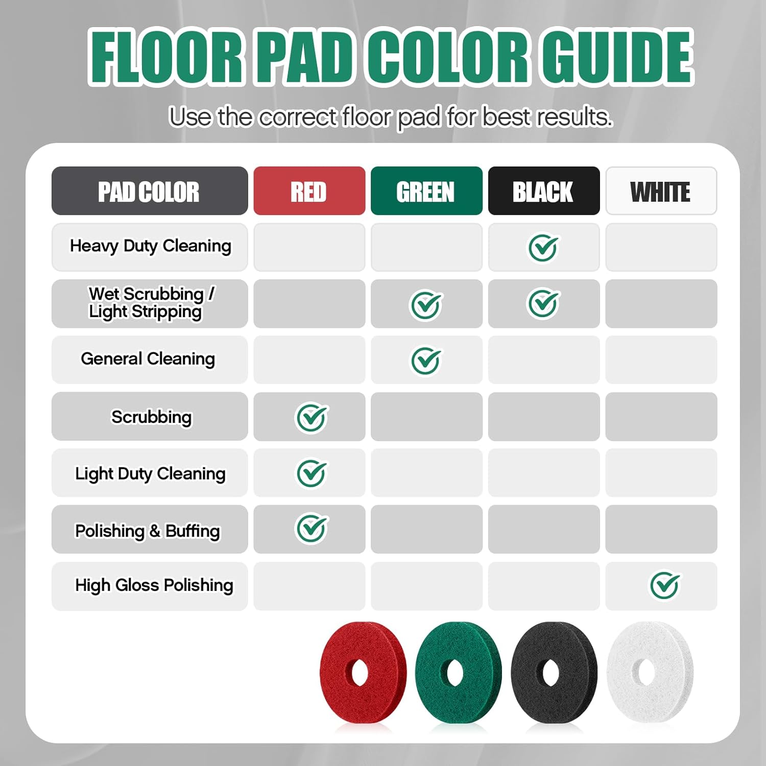 Features: Easy usage: Our set of 3 scrub pads not only excel in scalability and adaptability but ensures quality with their non woven, long lasting design. A reliable and effective cleaning tool. High friction: Our polishing floor pads are designed to last, capable of tackling heavy duty tasks like wax removal with their high friction, long lasting design. Specifications: Color: red, black, white Size: diameter about 20 inches/ 50.8 cm Package includes: 3 x Polishing floor pads Notes: Manual measurement, please allow slight errors on size. The color may exist a slight difference due to different screen displays. Please check specific size information before choosing our products