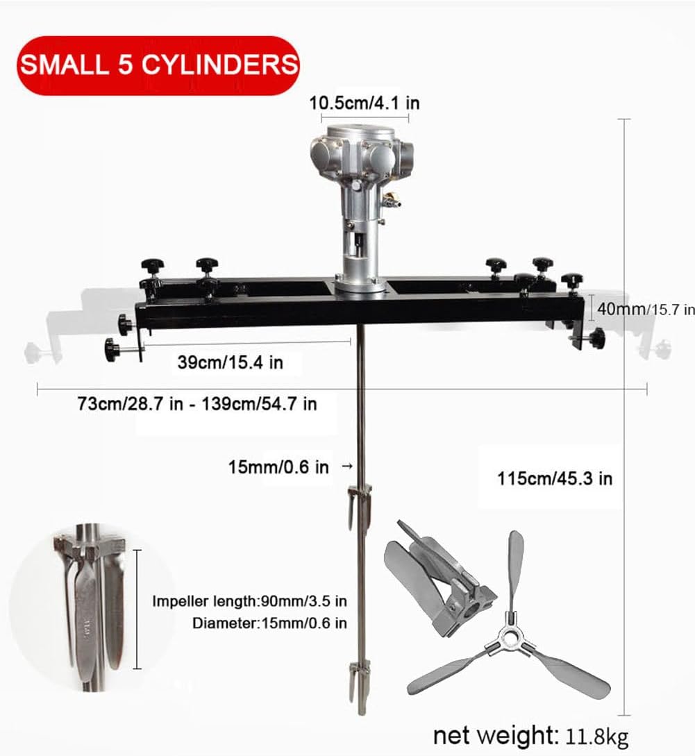 ✔ Model R-8030: Triple Pneumatic Mixer1. Core Parameters:Dimensions/Weight: 116cm length, 10.38kg net weight → Stationary use recommended.Performance: 1/2HP motor, 0-2500 RPM → Adjustable speed for diverse viscosities.Capacity: 6-8KG working pressure, handles 1000L volumes (e.g., bulk paints, industrial compounds).2. Structural Highlights:Adjustable Mounting Arm: 75-137cm telescopic range → Fits various container openings.Impeller: 90mm length, 15mm diameter → High-speed rotation for low-to-medium viscosity fluids (paints, adhesives).3. Key Components:Triple Pneumatic Motor: Spark-free for hazardous areas.Locking Collar + Knob: Ensures vibration-free stability during heavy-duty mixing.4. Applications:Industrial-scale blending of paints, raw materials, food sauces. Solves challenges in mixing large-volume/high-viscosity substances with safe, efficient air-powered performance.✔ Model R-8050: Compact Five-Pneumatic Mixer1. Core Parameters:Dimensions/Weight: 115cm length, 11.8kg → Fixed workstation use (factories, warehouses).Performance: 3/4HP motor, 0-1800 RPM → Superior torque for high-viscosity materials.Capacity: 6-8KG pressure, 1000L batch processing.2. Structural Highlights:Telescopic Arm: 73-139cm adjustable span → Compatible with reactors, storage drums.Impeller: Optimized for medium-high viscosity fluids (resins, coatings).3. Key Components:Pneumatic Motor Head: Intrinsically safe design.Reinforced Mounting: Minimizes wobble under heavy loads.4. Applications:Large-scale mixing in plants, paint production, food manufacturing. Addresses "high-viscosity/bulk material challenges" with industrial-grade power and safety.Easy Installation:Tool-free knob adjustment → Simplified for workers.