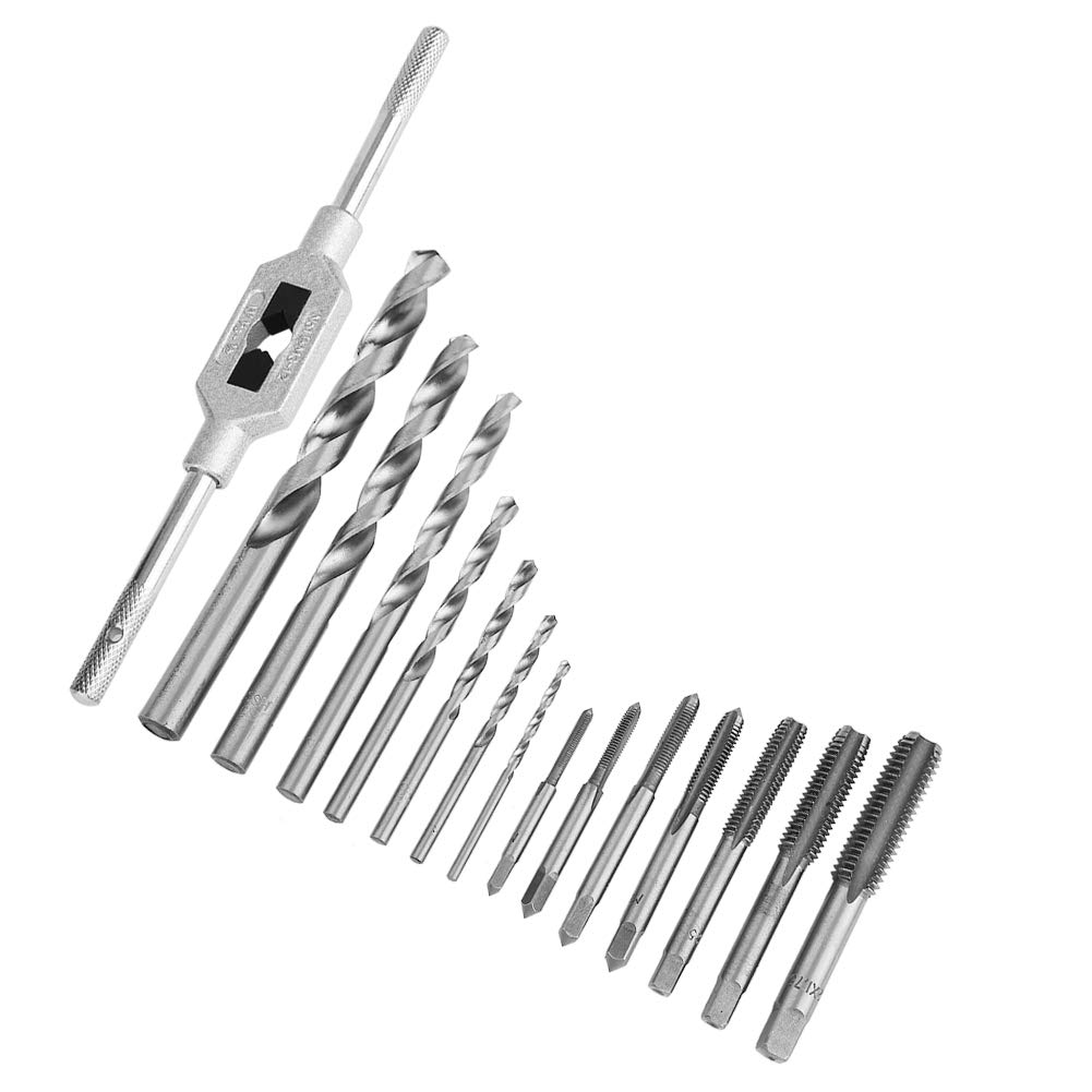Features:1. Made of alloy steel, high hardness and durability.2. There are 15 pieces of many different sizes in a set.3. They are great for most drilling jobs and materials processing.4. Incisive twisted drill bits will make the drilling easier and more effortless.5. A good helper for metal processing. Specification:Condition: 100% Brand NewMaterial: Alloy SteelTap Wrench Model: M3-M12Screw Taps Model: M3X0.5, M4X0.7, M5V0.8, M6X1, M8X1.25, M10X1.5, M12X1.75Drills Model: 2.5, 3.3, 4.2, 5, 6.8, 8.5, 10.2Weight: Approx. 620g / 21.9ozBox Size: Approx. 152 * 108mm / 6.0 * 4.3in Package List:1 * Tap Wrench7 * Screw Taps7 * Drills
