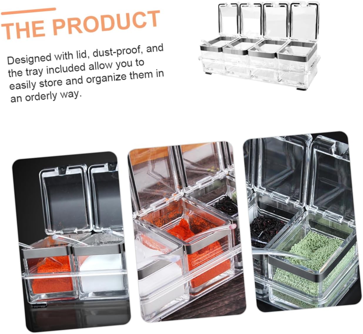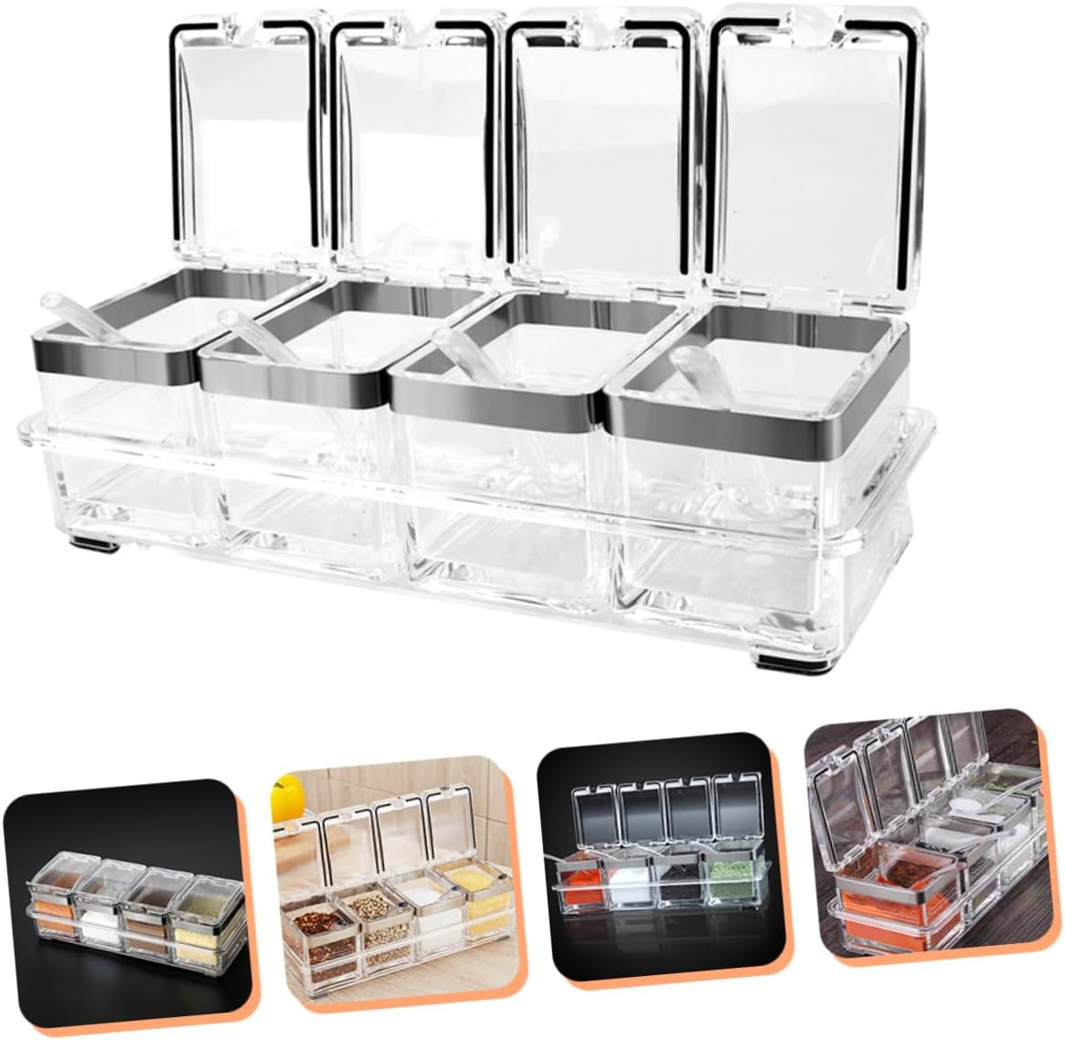 Package Include 4 x Seasoning Boxes 4 x Spoons 1 x Organizing Tray Characteristics -Material: Acrylic, stainless steel spice jar -Color: Transparent sugar container - Size: 25.00X9.50X6.20cm/9.82X3.73X2.44in condiment containers with lid - It's an for keeping your favorite salt, sugar cubes or dried perfectly dry and clean salt jar. - With lid, prevent water and . All components are dishwasher safe and easy to clean seasoning containers. - With a nonslip tray to and organizer all seasoning boxes. Easy to and wash condiment containers with lids. - Can be used to hold a variety of condiments, such as pepper, sugar, salt, spice, etc seasoning jars. - Keeps your condiment fresh and prevent the seasoning the or other things spice containers.Goods Descriptionseasoning jars Its clear design will look elegant on you countertop, and make it more easy for you to recognize the content.salt jar It can be used to place various condiments, like salt, pepper, sugar, spices, chicken soup powder, etc.spice jar Bring huge convenience for cooking