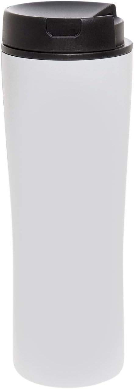 Minimalist black on white vacuum sealed coffee tumbler. Ergonomic design fits perfectly in cup holders and in hand when on the go. Keeps beverages cool and hot, consistently and holds up to daily use. Swivel top. Holds 16 oz.
