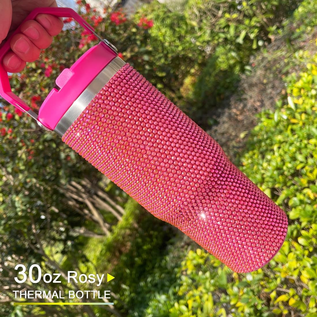 This 30oz Bling Rosy Rhinestone stainless steel tumbler with lid and straw keeps you hydrated all day, perfect for water, smoothies, or iced coffee. Its double-wall vacuum insulation and 18/8 stainless steel keep drinks cold for 12 hours or chilled for 2 days. The leak-resistant flip straw and ergonomic rotating handle make it ideal for on-the-go use, fitting most car cup holders and exercise machines. Durable, BPA-free, and dishwasher-safe, it’s built to withstand daily wear and tear, making it a reliable companion for commuting, workouts, or outdoor adventures.