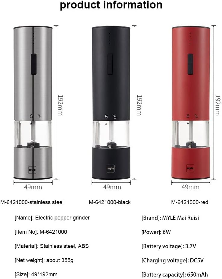 Description:Elegant; contemporary design factory in various colors.Fully adjustable; each grinder can be adjusted, from grinding to coarse grinding.Fully automatic; electric grinder automatically grinds and activates via button.Easy to fill; to fill the grinder, just turn the top cover counterclockwise, remove the top and fill the bottom of the base.Specification:Power: 6WMaterial: stainless steel + ABSBattery voltage: 3.7VNet weight: about 355 gCharging voltage: DC5VSize: 49 * 192mmBattery capacity: 650mAhPackage includes: 1* pepper grindersPlease Note:Due to hand measure, the size may have 1-2cm error.Due to different monitor and camera lights may cause slight color differences, mainly in kind of all colors.Due to long shipping, the item may damage in transit, if the item damage, pls us firstly immediately before leave feedback, thanks for your understanding.Easy to use: hand , easy to press button. Easy to clean: Detachable parts can be cleaned easily.