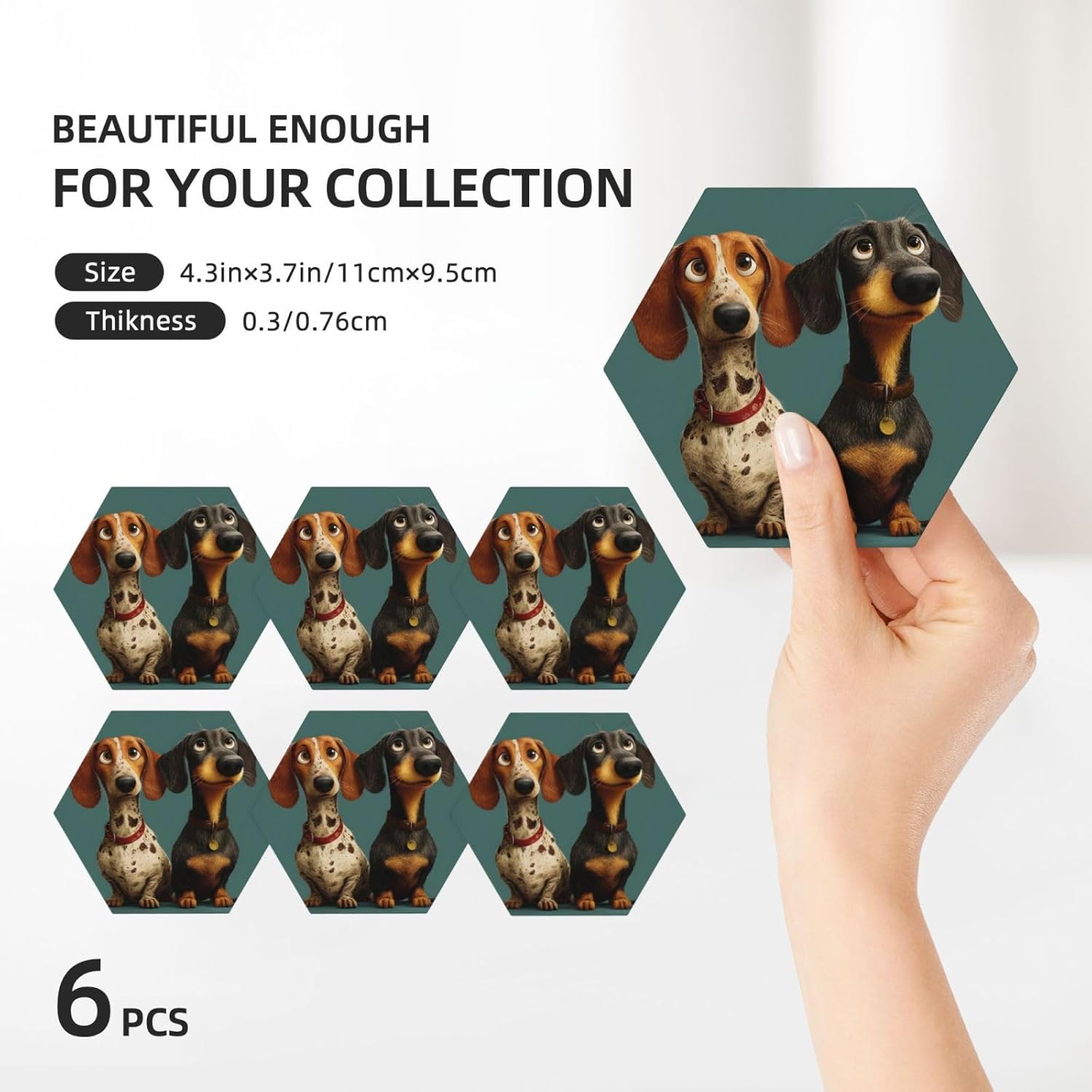 Product Name: DCEHGEW Ceramic Drink CoastersMaterial Type: Ceramic with cork bottomSize: Round: 4.1 x 4.1 inches, Square: 3.9 x 3.9 inches, Hexagon: 4.3 x 3.7 inchesPattern: Dachshund Weiner Pet Dogs About Our Ceramic Absorbent Coasters:Product Features - Crafted from high-quality ceramic, these coasters are odorless and eco-friendly. Their superior absorbency keeps your surfaces dry by quickly soaking up spills from coffee, cola, and other beverages within 10-15 seconds.Applicable Scenarios - Perfect for adding a stylish touch to your kitchen, living room, bar, hotel, or restaurant. These coasters are an ideal present for birthdays, Mother's Day, Father's Day, Valentine's Day, anniversaries, housewarming celebrations, or Christmas.Accessory Structure - Each set includes 6 ceramic coasters with cork bottoms, accompanied by a sleek black metal stand for organized and aesthetic storage. Choose from three different shapes to suit your style and needs.Washing Instructions - Easily clean these coasters with water or a damp cloth.Special NoteDue to different measurement methods, a deviation of up to 0.3 cm in size is considered normal.Please Note:The product images are for reference only. Actual products may vary slightly due to production factors such as batch differences and machine settings. Minor variations in color, position, and size are normal and not considered defects. Thank you for your understanding!Customer Service:We want to make sure you have an amazing experience with us. Please contact us with any feedback you may have. We love to hear from you and usually respond within 12-24 hours.