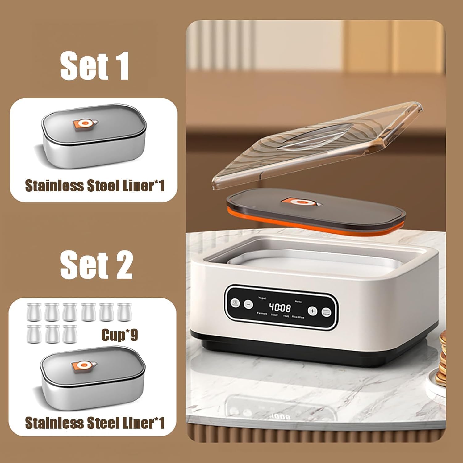Capacity & Design Capacity: 1.2L – Prepares 4–5 servings (ideal for families, meal prep, or probiotic-rich yogurt batches). Dimensions: 7.68” x 8” – Ultra-compact design fits seamlessly in small kitchens or for travel. Materials: Food-grade stainless steel inner pot + 5 removable cups. Precision Controls Adjustable Temperature: Microcomputer-controlled heating with ±0.5°C accuracy. Custom Timer: Set fermentation for 1–36 hours – auto-shutoff prevents over-fermentation. LCD Display: Track real-time temperature, countdown timer, and fermentation stage at a glance. Efficiency & Ease One-Touch Operation: Start fermenting in seconds – no complicated settings. Quiet & Energy-Saving: 15W low-power mode. What’s Included Base Unit: Yogurt maker with stainless steel pot. Why Choose This Yogurt Maker? Lab-Grade Precision: ±0.5°C accuracy outperforms competitors (±1°C standard) for stronger probiotics. Versatile Use: Ferment dairy, coconut milk, or even vegan nut-based yogurts. Space-Saving: Smaller than a coffee maker but holds 50% more than similar models.