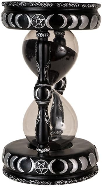 This mystical sand timer adds an enchanting touch to any space. Crafted with intricate detailing, it features moon phases and a pentagram design, making it an ideal addition for meditation, time management, or ritual use. The black sand flows smoothly through the hourglass, creating a captivating visual. With its witchy aesthetic, this sand timer is a unique decor piece that will elevate your surroundings with its enigmatic charm. Embrace the passage of time in a mesmerizing way.