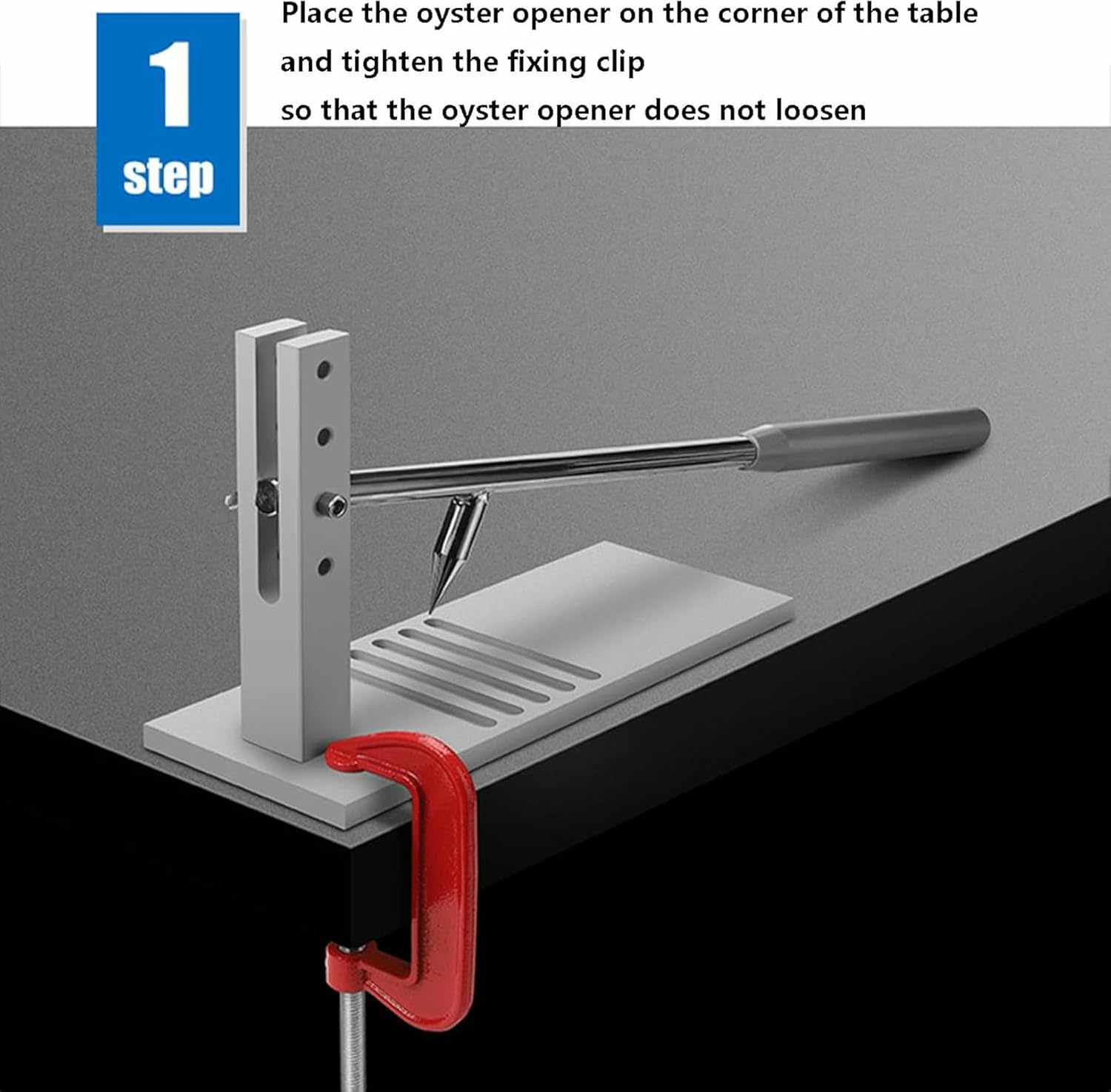 Oyster Shucker Tool Set Adjustable Oyster Clam Opener MachineSafer & More efficientHere we offer you a high-quality oyster shucker tool set. It can open the shells in a fast, easy, fun, and secure way; never worry about cutting your fingers, a practical tool to open various shellfish shells.How to shuck an oyster1.Connecting rod aligns with base screw hole and tightens screw to fix.2.Fix the boom to the proper gear.3.Tighten the butterfly nut by passing the long butterfly screw through the connecting rod and forcing arm hole at the same time.4.Press the handle up and down to adjust it to the proper tightness so that it can be used.Product Details:Material: Aluminum AlloyColor: SilverSize: 265*100*160mm/10*4*6inchesScope of application: Opening oysters, mussels, scallops, abalone and other shellfishPacking List:1 * Oyster Opening Tool Set