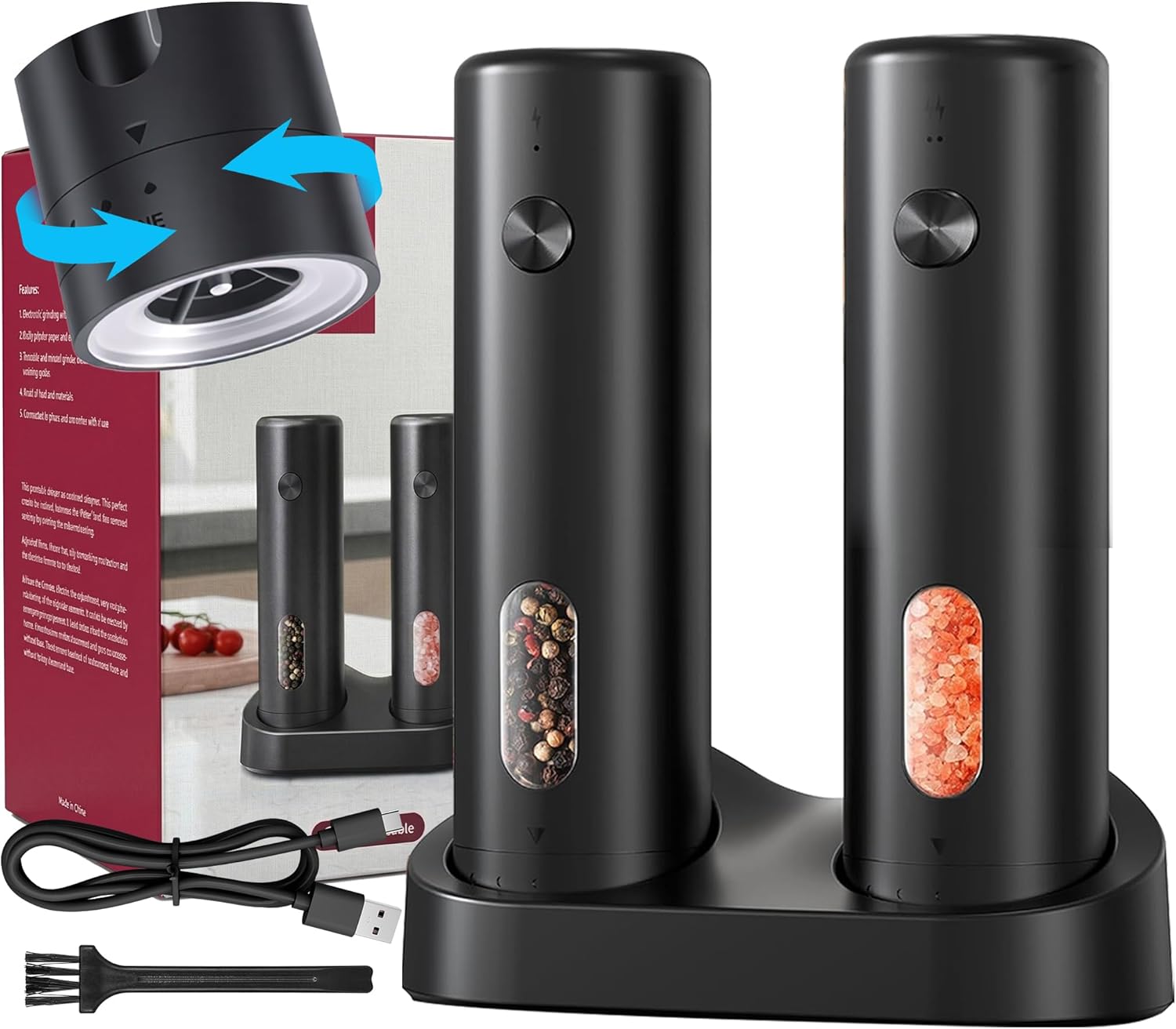 • 【Reliable USB-C Rechargeable Battery】Powered by a 600mAh rechargeable battery, this rechargeable salt and pepper grinder set runs for weeks on a charge. The included USB Type-C charging base (use any phone charger) eliminates battery hassle. Never face a dead grinder mid-cook. A dependable, modern kitchen companion