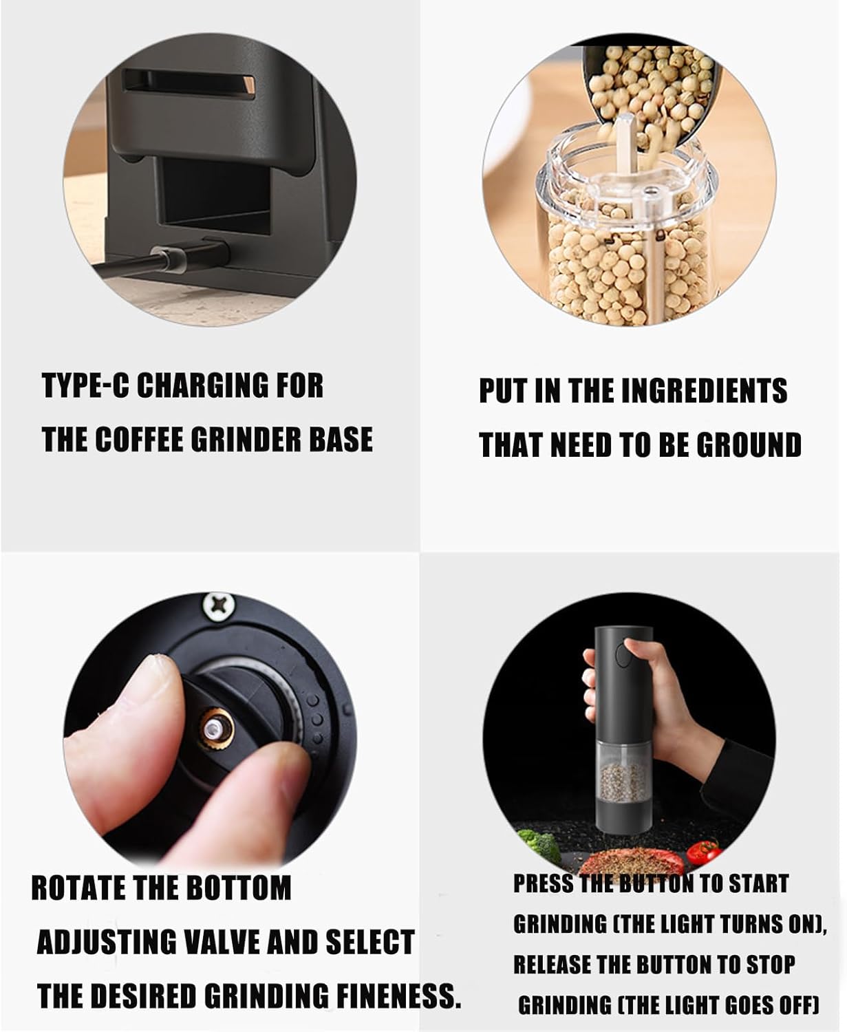 Portable Electric Pepper Mill With Rechargeable Battery Adjustable Coarseness Salt Grinding Tool Set For Home Cooking Features: This rechargeable electric pepper and salt grinder features adjustable coarseness setting for perfect spices texture control, combining cordless convenience with precisions grinding technology Craft from ABS, its compacts motorized design delivers powerful grinding for salt, peppercorns, and spices with button operations Ideal for home cooks, busy professional, and baking enthusiasts seek restaurant seasoning control in daily meal preparation Enhances kitchen countertops efficiency or elevates dining with this portable spices grinder ' s quick recharging capability and travel friendly size The ergonomic button activated mechanism ensures single hand operations during cooking, while its modern design complementing modern kitchens aesthetic seamlessly Specifications: Component: ABS Grinder Color: Silver Optional Styles: A 2pcs Grinder with Clear Stand ( without charging function), B 2pcs Grinder with Black Charging Base, C 1pc Grinder without Base Grinder Size: Approx 9x9x22cm / 3.54x3.54x8.66in Package Includes: 1 set Electric Grinder Note: Please allow 1-3cm error due to manual measurement please make sure you not mind before you bid Due to the differences between different monitors, the picture may not reflect item ' s actual color