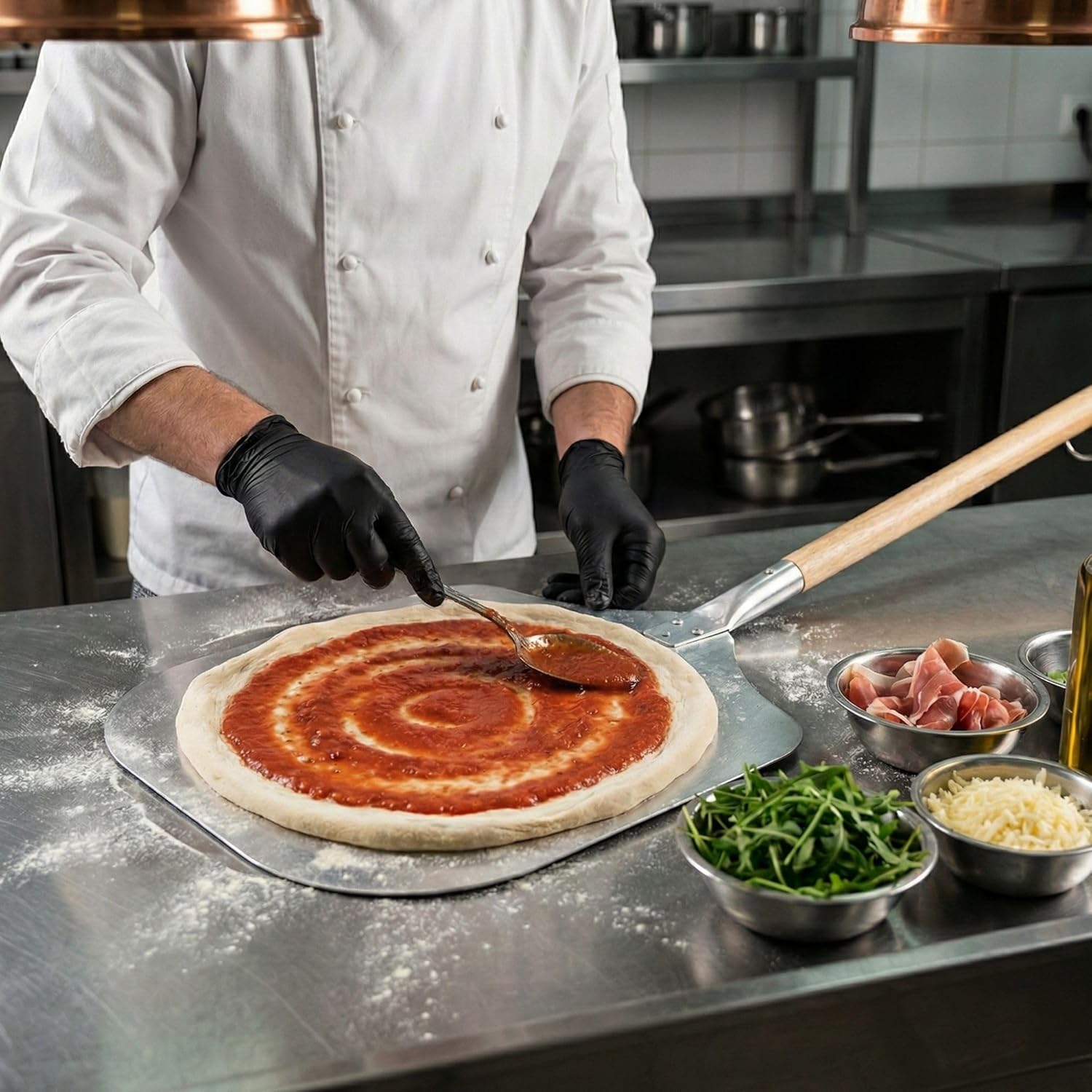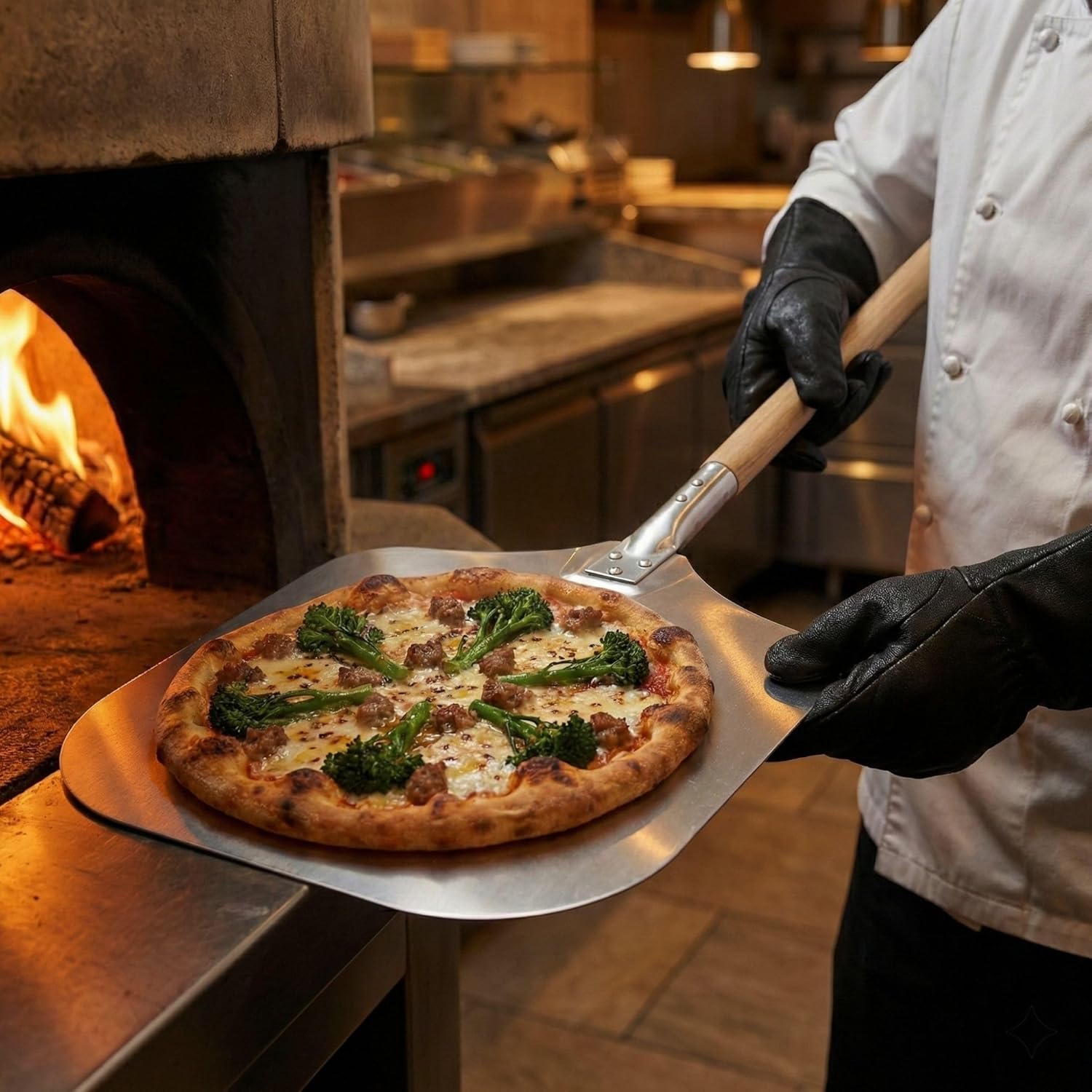 Transfer pizzas and breads into ovens with ease using our Met Lux Aluminum Pizza Peel. Made from high-quality aluminum and rubber wood, this pizza peel is crafted to be durable and long-lasting, making it a must-have addition to your pizza making supplies. Designed with an ample blade, this pizza paddle provides enough room to fit a large pizza, several loaves of bread, or pastries. This pizza spatula is equipped with a 21-inch wooden handle that keeps your hands safely away from high heat and eliminates any chance of being burned while transferring foods into ovens or grills. The extended handle provides a comfortable and secure grip so you can easily handle pizzas without the risk of causing spills or accidents. For a quick and effortless clean up after use, simply hand wash and wipe down this pizza spatula. This pizza peel measures 14 inches in length by 12 inches in width, with a 21-inch handle. The total length of this pizza paddle with its handle is 35 inches. Shipped in 1 count box.