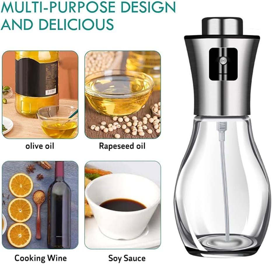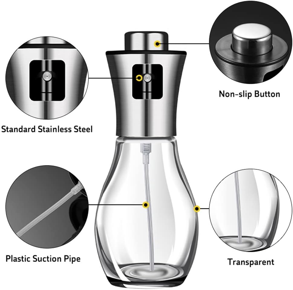 Anti-slip bottle bottom, three-dimensional groove design, increase friction, effectively anti-slip.Use with oil, vinegar, soy sauce, lemon juice or wine. The first time you need to squeeze 2-3 times.Type: Fuel Spray BottleColor: silverCapacity: 200mLStainless Steel Cover: SilverMaterial: glassColor as shownUses: kitchen tools, barbecue, salads, bakingFunction: kitchen oil bottle, edible oil sprayer bottle, glass oil sprayer oil, oil sprayer dispenser, glass bottle sprayer function.Package Included:1 oil spray bottlePlease note that due to differences in lighting and computer monitors, we cannot that the actual color is the same as the picture.Due to different measurement methods, there may be an error of 1-2 cm.A non dripping spout can reduce unnecessary oil leakage, solve the trouble of cleaning oil bottles, and keep the kitchen clean