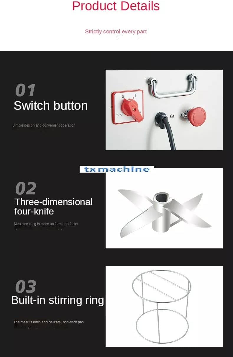Specification: Two type meatball beatering machine:1. Without on-off switch and stainless steel sheel 2. With on-off switch and stainless steel shellProduct name: Meatball beater Model:#18# 20/#22/#24 Voltage:110V/60HZ,220V/50HZ Power:1.5KW/1.5kw/2.2kw/3kw Speed:2800rmp Weight:20kg/25kg/30kg/35kg Capacity:0.5-2kg/time,0.5-2.5kg/time,0.5-3kg/time,0.5-3.5kg/time Dimension:30*36*78cm/35*31*83cm/35*31*85cm/40*33*88cm In-barrel diameter:18cm/7inch,20cm/7.87inch,22cm/8.66 inch,24cm/9.44inch Feature: Material: stainless steel With motor Application: Automatic meat grinder, various capacity, both can used for domestic and commercial