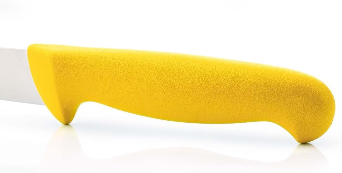 Arcos 2900 kitchen knife - Prof 290400 made of Nitrum stainless steel and ergonomic Polypropylene handle and 13 cm (5.12") blade, sheath display The colors differentiate the food to be cut for better hygienic control Product Description: Arcos 2900 - Butcher Knife 13 cm (5.12"). Designed for professionals who require prolonged use. Exclusive high-performance stainless steel and durability NITRUM. ergonomic handle, comfortable and safe to perform activities naturally. They are made of injected polypropylene (PP), a hygienic plastic material with good shock stability, non-slip and resistant to high temperatures (120-130ºC). The union between the handle and blade is permanent thanks to the injection process with which they are joined. Identifying handles Colored identifiers: The color of the handle identifies the knife to differentiate the food that is cut, thus achieving a better hygienic-sanitary control for the consumer, based on European regulations. Yellow: Cooked food Red: Meat Blue: Fish Green: Vegetables and fruits Brown:Vegetables White: Pastry and dairy Black: MultipurposeSPECIFICATIONSHandle: Polypropylene Blade: Stainless Steel NITRUM Blade size: 13 cm (5.12"). Presentation: Display Case Usage: Butcher