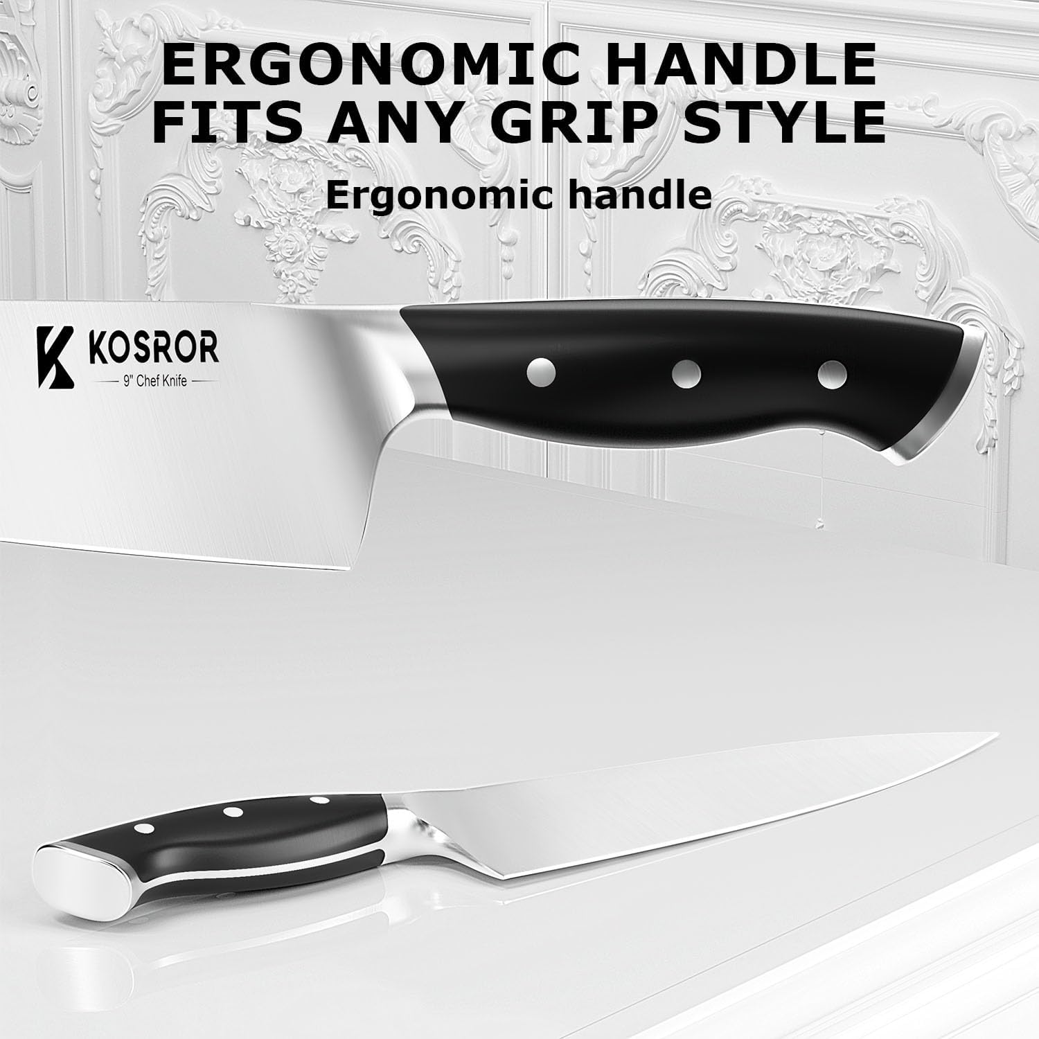 Included Components 9-inch Chef Knife, 8-inch Slicing Knife,8-inch Bread Knife,7-inch Santoku Knife,5-inch Utility Knife,3.5-inch Paring Knife, six 4.5-inch Serrated Steak Knives, Kitchen Shears, a Built-in dual Sharpener, and is complemented by an Oak Wood Knife Block for organized storage.​It covers all home cooking tasks – from dicing vegetables to carving roasts and hosting dinner parties.​, High-end Elegant Black Box, Instruction Manual, KOSROR Brand Warranty Card, Sharpener(​The 30-Second Refresh: Make your built-in sharpeners the maintenance hub for all your knives.​)