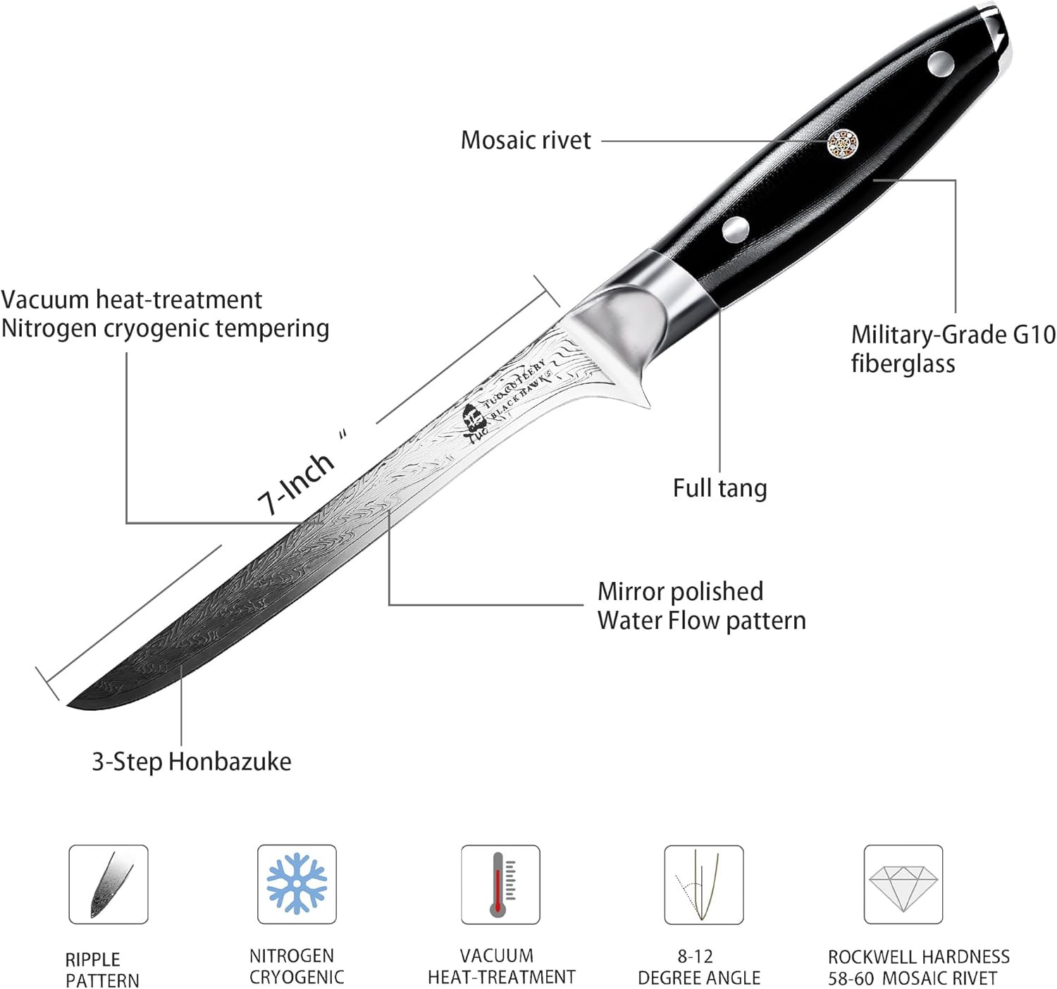 • 🔪PERFECTED BONING KNIFE: The Black Hawk S 7-Inch Boning Knife, featuring a narrow blade and a tapered tip and is designed to de-bone, fillet, skin and trim the meats with nimble controls. Adopting special-forged high-carbon stainless steel with a precise vacuum heat-treatment and nitrogen cryogenic tempering, it ensures you the extreme strength, flexibility, durability, and maximum performance.