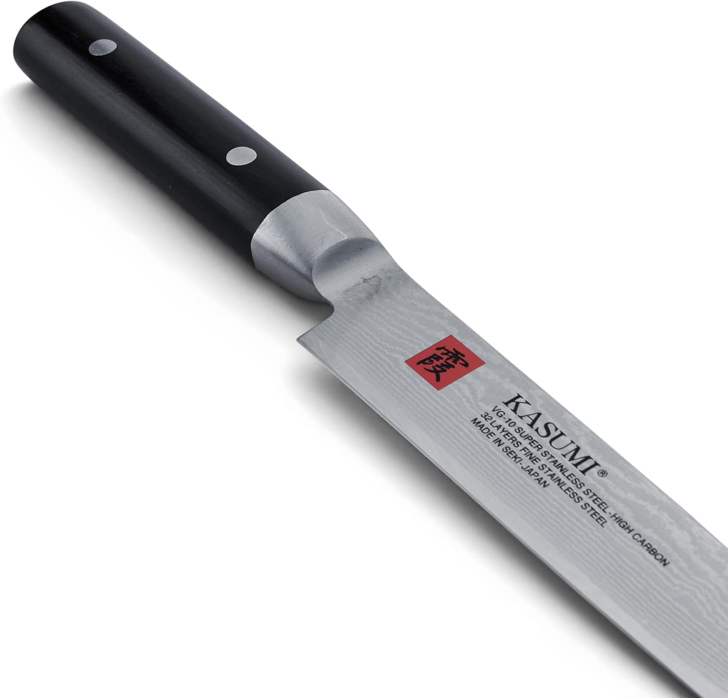 Kasumi knives are produced by Sumikama Cutlery in Seki, Japan. Sumikama Cutlery specializes in producing knives from the most advanced materials with the most advanced manufacturing techniques. Kasumi V-Gold No. 10 Damascus Pattern knives are made from 33 layers of stainless steel. Only the middle layer acts as the cutting edge, and it is made using V-Gold No. 10 stainless steel. V-Gold No. 10 is a high carbon stainless steel with cobalt, manganese, molybdenum and vanadium for added durability and ease of sharpening. The addition of cobalt to this steel requires special tempering in order to maximize the full benefit of this steel. Sumikama's technique for this special tempering is a closely guarded secret.