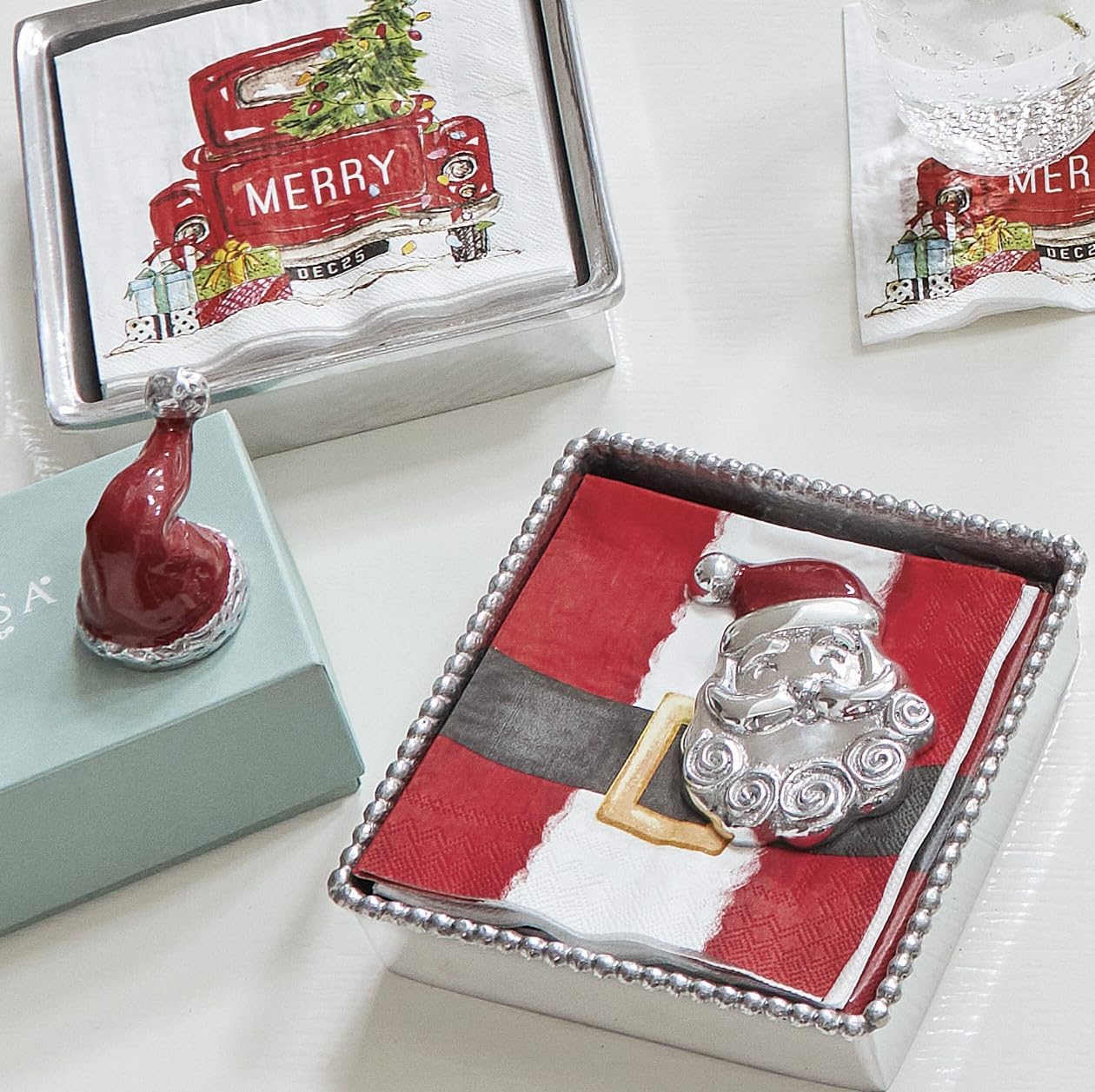 A festive Smiling Santa Beaded Napkin Box Set adds a little winter magic to your next holiday party. Add a personal touch by pairing this Smiling Santa Beaded Napkin Box Set with our Hugging Santa Platter, both handcrafted from 100% Recycled Aluminum.