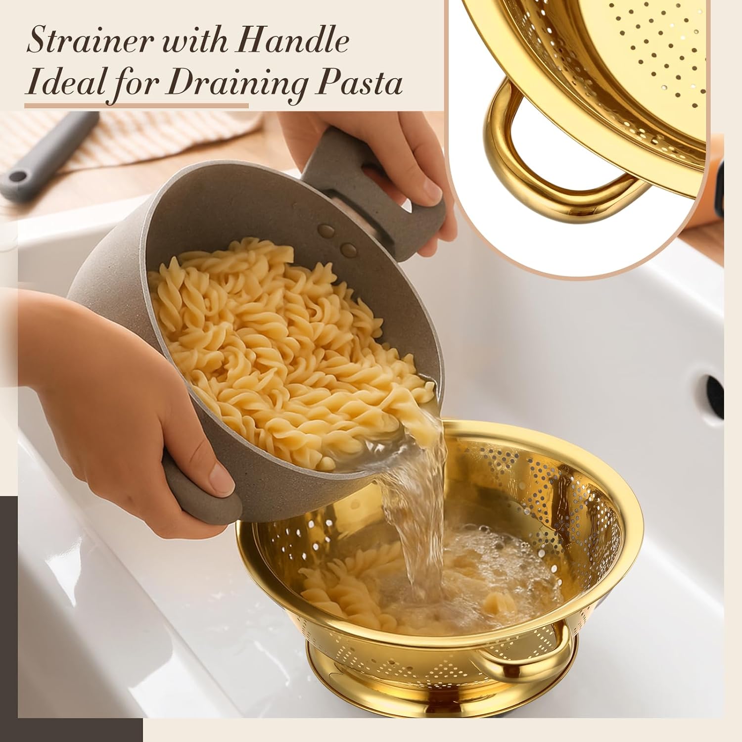 Features: Each strainer and colander is polished to a smooth, mirror-like finish, ensuring that it resists rust, corrosion, and tarnish for extended use. The colander and fine-mesh strainer have handles for easy grip and carrying, making it easy to drain large amounts of food quickly and safely. Specifications: Material: stainless steel Color: gold Size: Gold Colander: 4.5 Quart Fine Mesh Strainer: 4.72 inches/ 12 cm, 5.51 inches/ 14 cm, 6.3 inches/ 16 cm Package includes: 1 x Stainless Steel Colander 3 x Fine Mesh Strainer Notes: Manual measurement, please allow slight errors on size. The color may exist a slight difference due to different screen displays