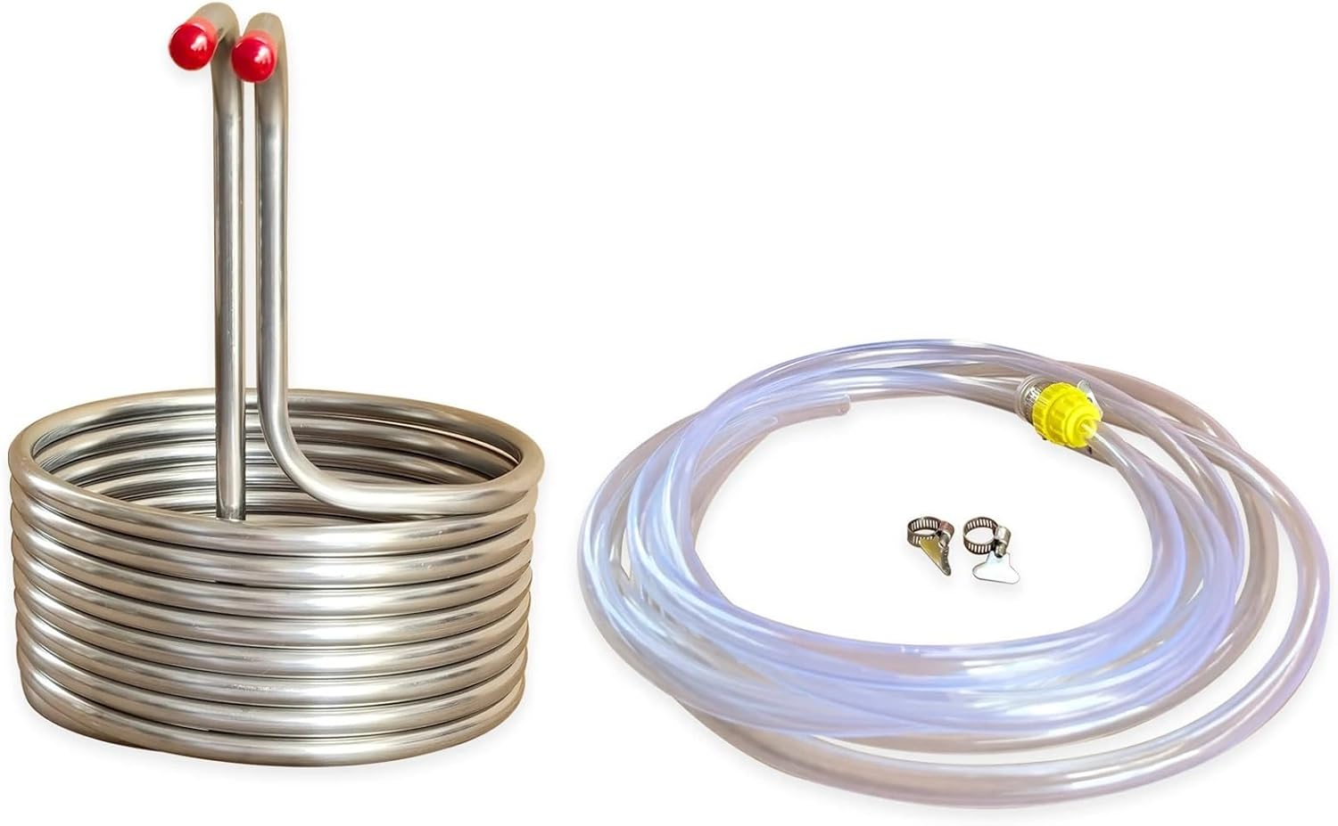12.7mm Stainless Steel Cooling Coil Tube Heat Exchanger With Connector Fittings,Home Brewing Immersion Chiller,Food Grade Wort Chiller Rapid Beer CoolDescriptions:1.The wort chiller can be used for cooling the beer or hot malt.2.The cold water can flow through the tube,then absorb the heat from the wort mix and reduce its temperature.3.It is convenient to use,make the equipment directly into the hot wort,and then connect with the liquid from the faucet.4.Increasing the length of the coil allows a larger area of the wort in contact with the cold water, thereby minimizing the wort cooling time.5.This is fairly easy to clean, just clean the surface of the coil.Specification:Material:304 Stainless SteelColor:SilverOverall Height:315mmCoil Diameter:12.7mm(1/2 inch)Tube Thickness:0.7mmCoil Length: 7.6mCoil Height:12.5cmCoil Width:255mmCooling height:30cmAccessories:304 Stainless Steel Hose *2, 2 meters of food-grade PVC hose *2, faucet connector *1Water adaptor installation:1. First unscrew the filter of the basin faucet.2. Use the PTFE Thread Seal Tape to bind in the copper connection's thread.3. Screw in the Basin faucet.4. Then screw the connector to your tap.5. Last, connect the PVC hosesPackage Included:Beer Cooling Coil * 1304 Stainless Steel Hose * 2,2 meters of food-grade PVC hose * 2faucet connector * 1Note:Due to the light and screen difference, the item's color may be slightly different from the pictures.Please allow 0.5-2 cm differences due to manual measurement.==========Hign-concerned Chemical : NoneProduct Type : Wort ChillersMaterial : STAINLESS STEELSerial Number : HXL-0A003-004-AGrade : Food GradeMaterial : 304 Stainless SteelColor : SilverCoil Diameter : 12.7mm (1/2")Tube Thickness : 0.7mmCoil Length : 7.6mCoil Height : 125mm(4.92")