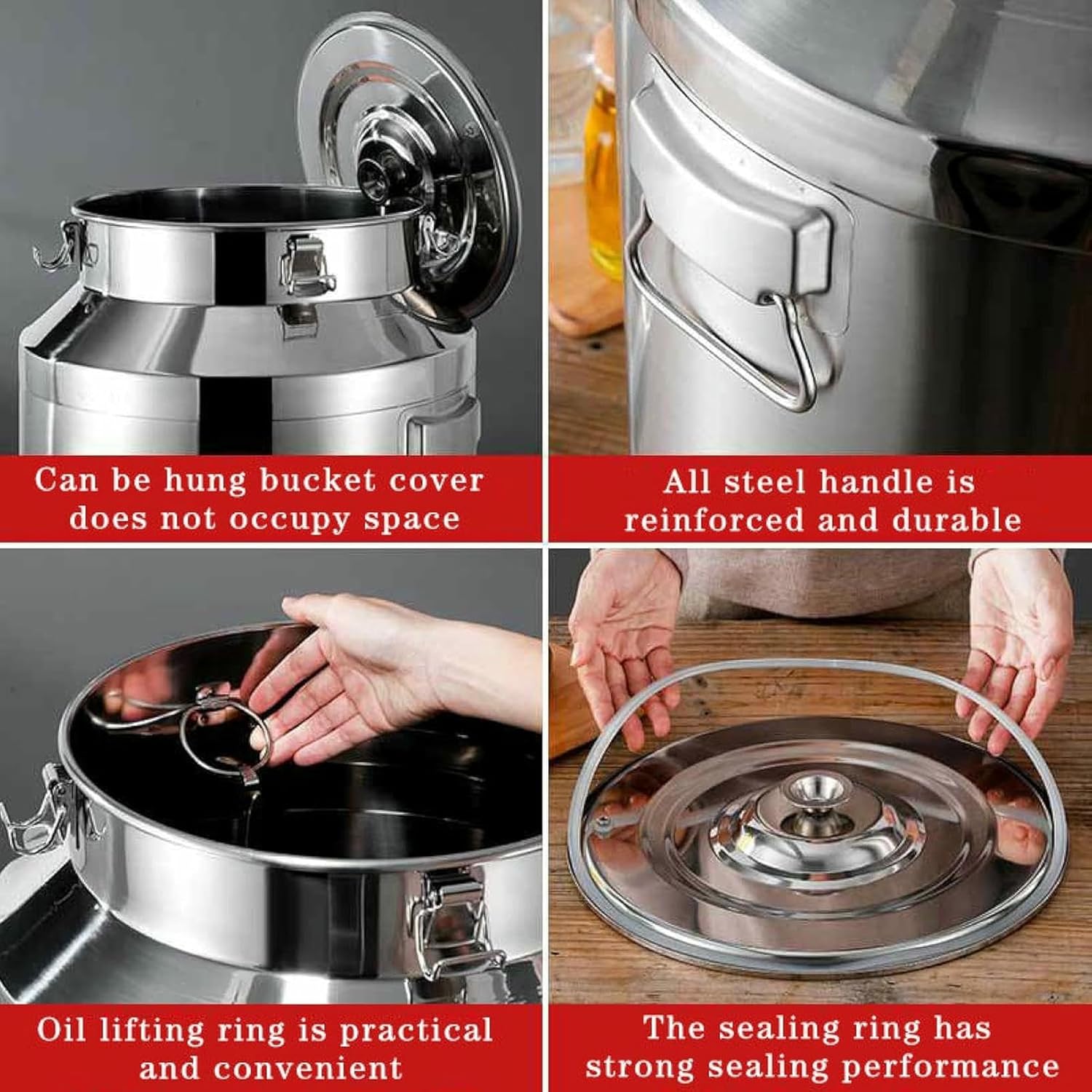 The milk bucket is made of large-diameter stainless steel and has a long service life; In addition, the stainless steel structure helps to sterilize before boiling. The bottle is embedded with silicone, which is more sealed. This is a single piece jar with bottom and top support, rather than welded together components, suitable for hard use in restaur. Milk cans are used to store oily milk, wine, etc. Often used at home, in restaur, or in commercial places. It's the perfect choice.Specifications:Box Material: Stainless SteelSealing material: SiliconeThickness: 0.04 "/1mmCapacity: 5L/14Lsize:5 liters: 17 x 24 centimeters/6.7 x 9.4 inches14 liters: 22 x 32 centimeters/8.7 x 12.6 inchesPackaging content:1 x stainless steel storage bucket