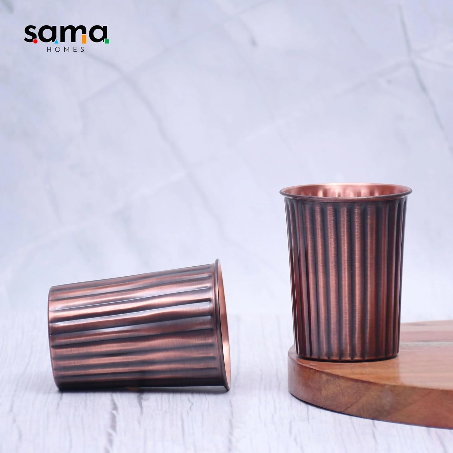 BuyPure Copper Water Glass Set of 2 Antique Rope Design Tumbler Capacity 300ML. Crafted from pure-quality copper, It is hand-made to create a unique and elegant textured surface:-This copper Tumbler Glass is constructed from pure quality copper. Designed to offer many years of use and enjoyment.SAMA Homes product have been applauded by patrons for their intricate design and incomparable craftsmanship.Copper Products Tarnish over time, this is Natural for Copper products. Please follow the care Instruction manual for cleaning Copper products. Instruction manual is provided with every order