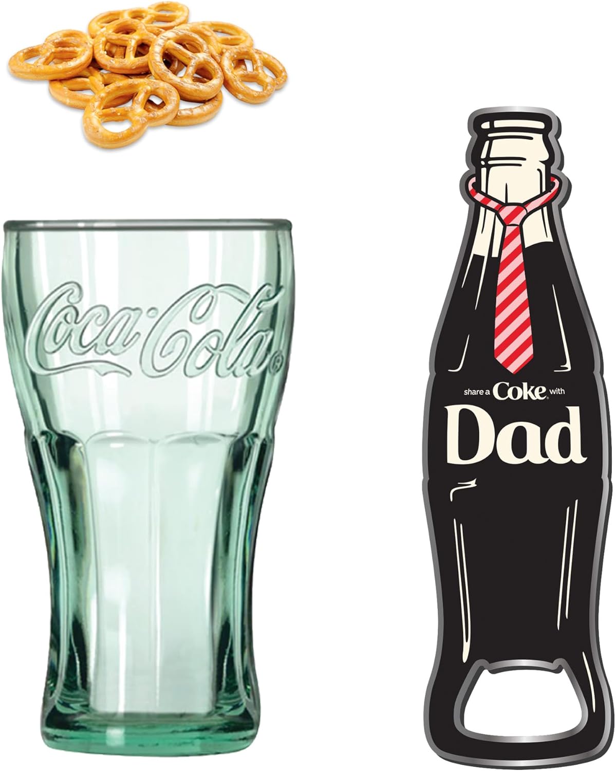 This Father's Day make any Coca Cola dad feel loved with the gift of this three piece pint glass gift set. It includes a genuine Coca Cola pint glass, a bottle opener in the shape of a bottle with a neck tie and the message "Coke Dad," and a bag of pretzels for when they get hungry drinking an ice cold Coke (Coke not included). Inside the pint glass is the message "Best pop ever." Gift set stands about 10.5" tall and comes wrapped in a Coca Cola bow.