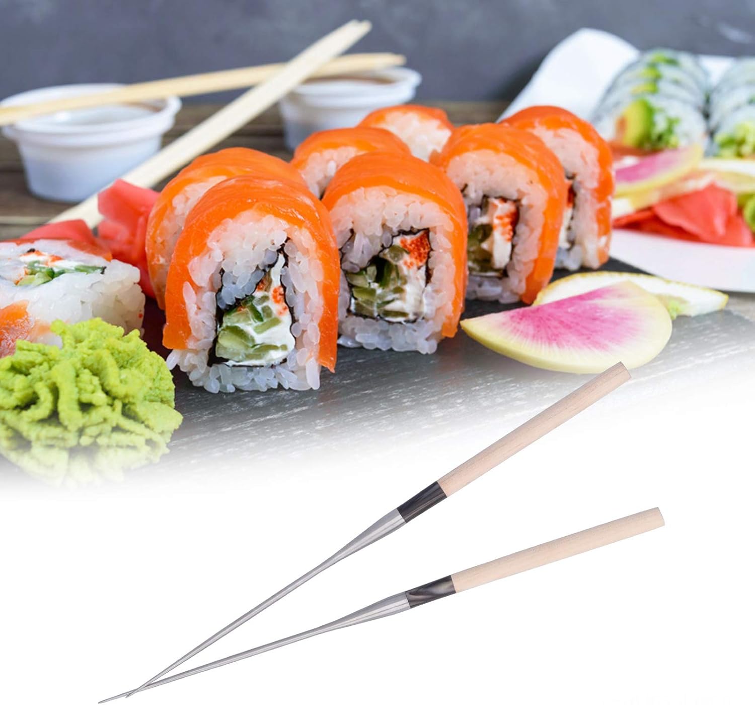 Specification: Item Type: Chopstick Material: 304 Stainless Steel + Wood Color: As shown in the picture Size: As shown in the picture Weight: Approx.120g/4.2oz Package List: 1 x Pair of Chopsticks Note: 1. Please allow 1‑2in error due to manual measurement. Thanks for your understanding. 2. Monitors are not calibrated same, item color displayed in photos may be showing slightly different from the real object. Please take the real one as standard.