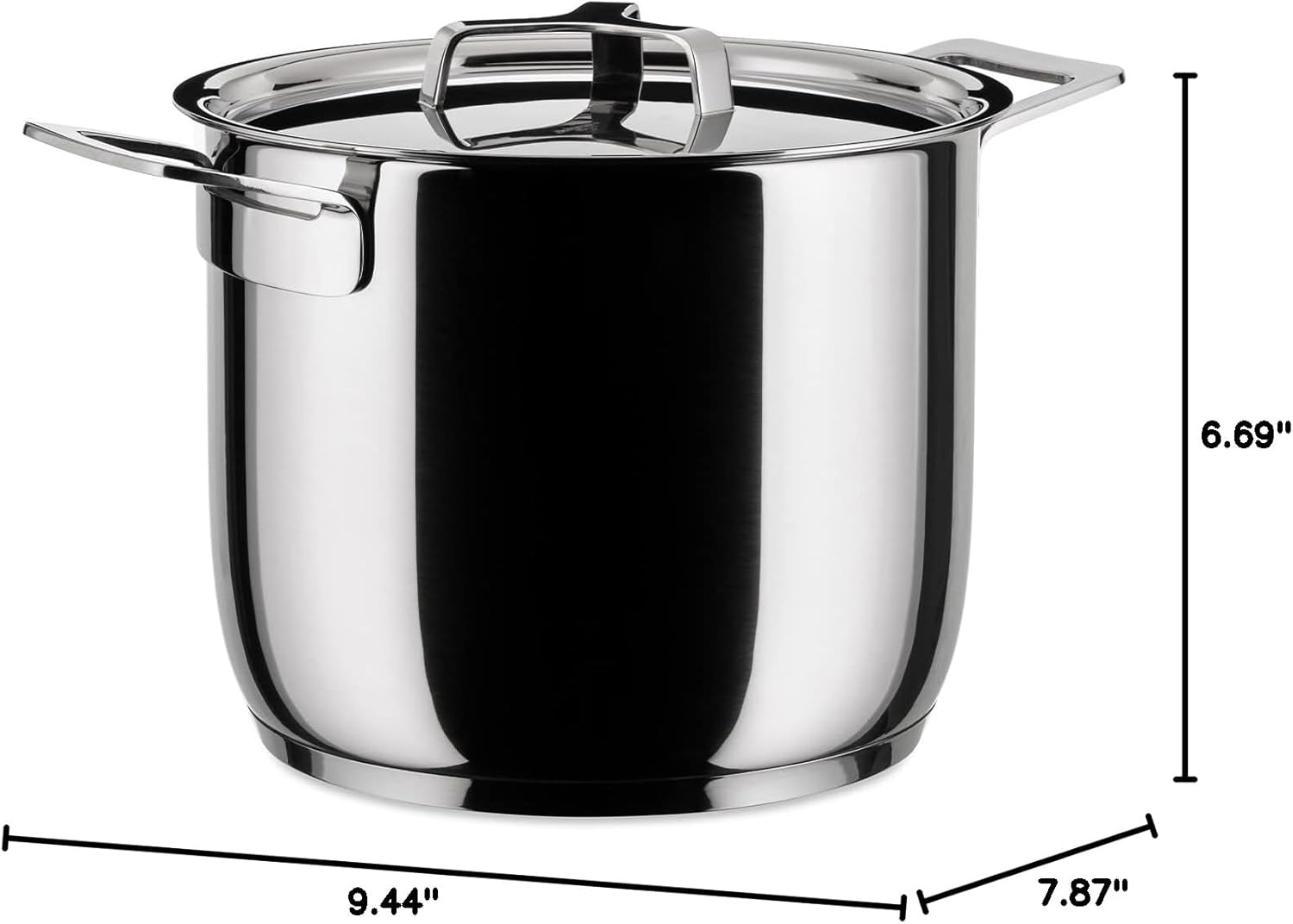 Stockpot in 18/10 stainless steel, mirror polished, with radiating bottom in thick aluminium covered in stainless steel. Suitable for cooking with induction, gas, electric hob, ceramic glass hotplate and in the oven. Dishwasher safe. The third series of Alessi pots had the ambitious goal of standing beside Sapper's copper and steel Cintura di Orione and also Giovannoni's aluminium-bottomed steel Mami , but occupying a much lower price bracket yet maintaining the same high design quality and high attention to functionality. Jasper Morrison took up the challenge of representing potness by developing his rigorous, linear and detailed style (for example the flared edge for pouring, the graduated scale inside the pots, the cover knob that lets you lift it with a wooden spoon) to produce something of a masterpiece in Super & Popular design. Corresponding lid for this pot is AJM200/20 sold separately.