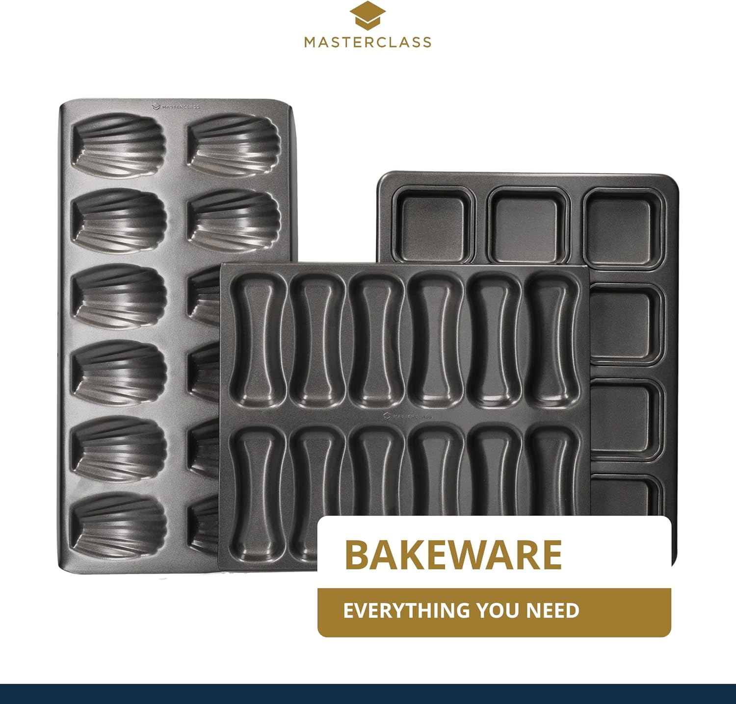 Product Description Since 1850, MasterClass has been trusted for its reliable, durable and innovative products. This madeleine tray is no exception. Like all of MasterClass’s best-selling, award-winning* bakeware, this madeleine baking tray is made of warp-resistant, 1 mm-thick carbon steel, with rolled edges to prevent water build-up and rust. It’s finished with a double layer of the Quantum II non-stick coating, sandblasted to its surface for better adhesion. It’s just the thing to master making delicate, fluffy madeleine cakes. Thanks to its specially shaped holes and exceptional heat transfer properties, it creates defined, golden brown cakes in the shape of pretty shells. Each madeleine mould measures 7.5 x 5.5 cm (3 x 2 Inch). A 24 hole madeleine pan, for making bite-sized bakes, is also available from MasterClass. Both madeleine cake tins are 100% PFOA, PTFE and BPA free.(*Winner: Bakeware - Best of Best Sellers, Housewares Magazine, 2013, 2014, 2015)Box Contains1 x Master Class 12-Hole Non-Stick Madeleine Tray, 40 x 20 cm Set Contains: 1 x Master Class 12-Hole Non-Stick Madeleine Tray, 40 x 20 cm
