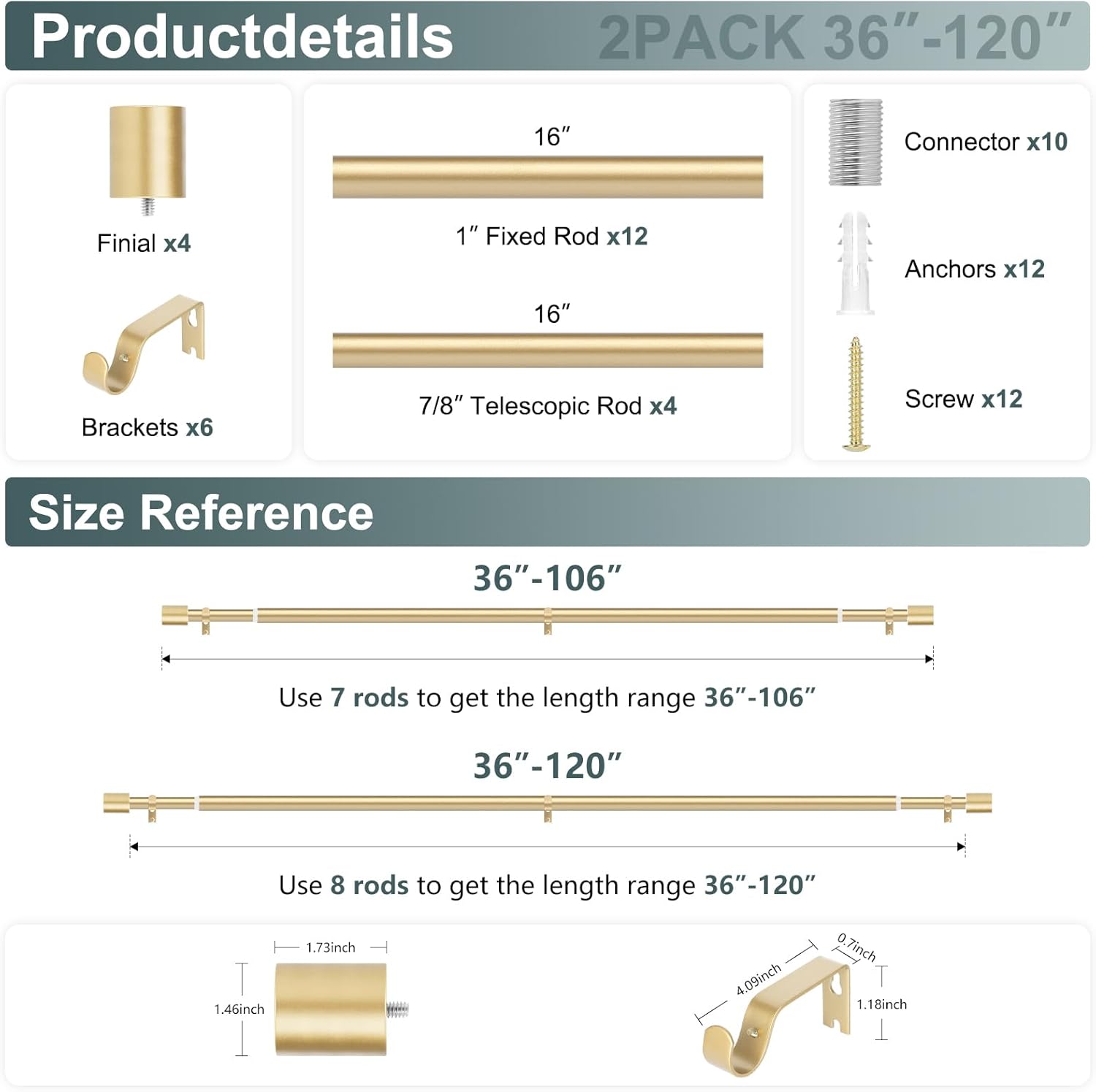 | Included Components | 1 x installation instruction, 10 x covnnector,12 x anchor,12 x screw, 12 x 16" x 1" fixed rods, 4 x 16" x 7/8" adjustable rods, 4 x finial,6 x bracket |