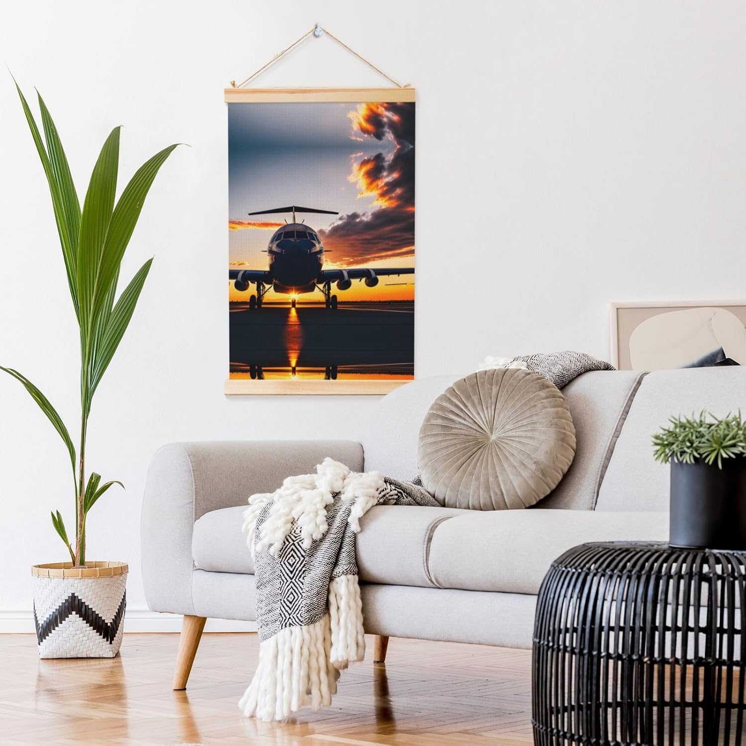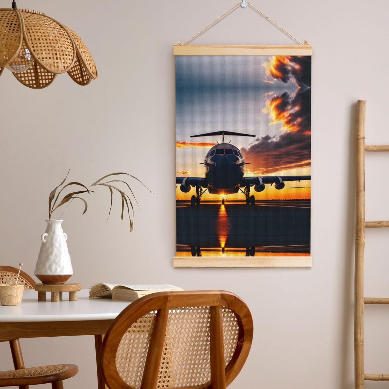 Our Aircraft Plane At Sunset Print Wooden Poster Hanger Is An Excellent Addition To Your Home Decor Or A Perfect Gift For Friends And Family. Made Of Selected Quality Canvas With Brilliant And Enduring Colors, This Wall Art Is Designed To Resist Water, Dust, And Fading, Ensuring The Bright And Vibrant Art Lasts. The Polyester Is Enclosed Between Two Teak Wood Hanger Scrolls With An Attached 35cm Rope For Easy Hanging. Installation Is Made Simple With The Included Two Nails In A Plastic Box. The Modern Minimalist Style Of Our Wall Hanging Complements Any Home Decor, Elevating The Artistic Ambiance And Brightening Up The Room. Experience The Elegant Transformation This Wall Hanging Scroll Painting Brings To Your Spaces Today.