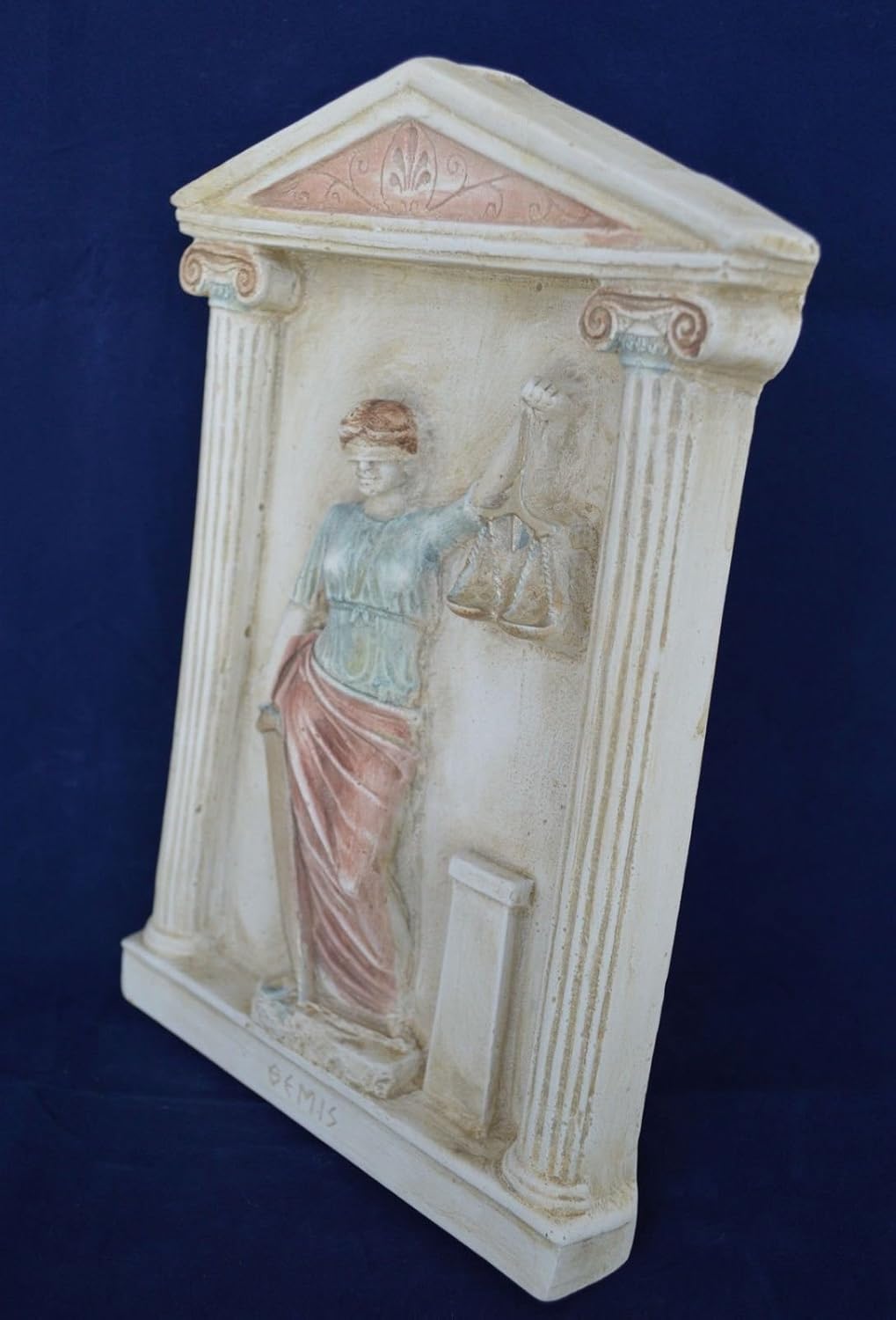 Themis (Greek: Θέμις) is an ancient Greek Goddess. She is described as "of good counsel", and is the embodiment of divine order, law, and custom. Themis means "divine law" rather than human ordinance, literally "that which is put in place", from the verb τίθημι, títhēmi, "to put". To the ancient Greeks she was originally the organizer of the "communal affairs of humans, particularly assemblies. Details: Condition: New, reproduction handmade in Greece. Approximately Height: 25cm - 9.8 inches Width: 16.5cm - 6.5 inches Weight: 0.9kg Material: Casting stone A great gift for All who serve Justice, Lawyers and Judges!!! ( A139)